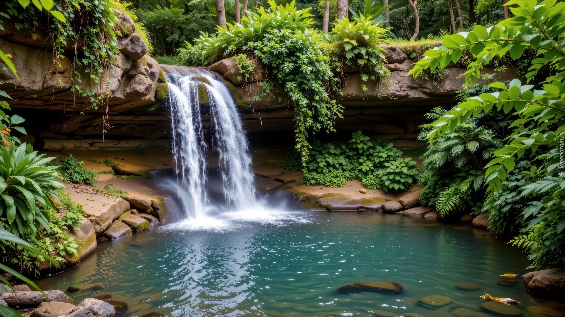Edytor tapety: Wodospad i roślinność na skałach