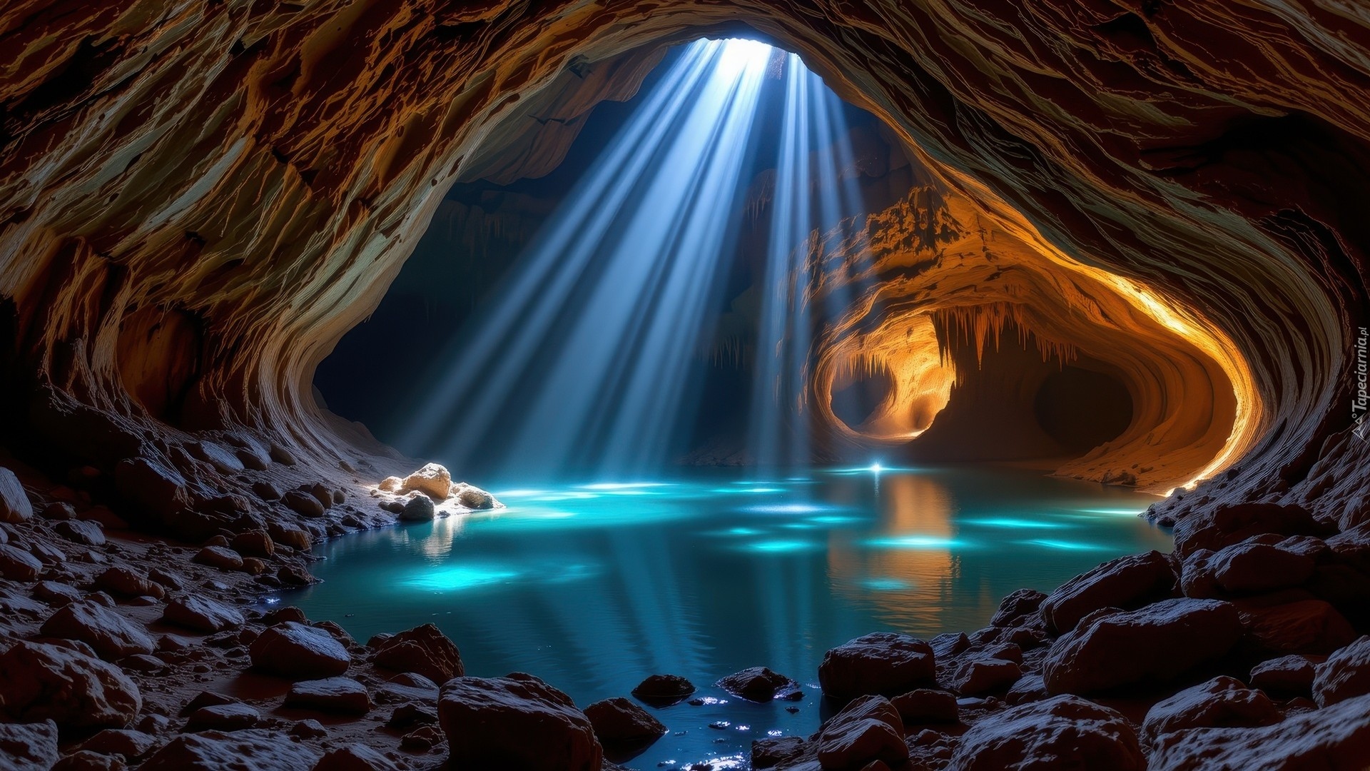 Edytor tapety: Przebijające światło i woda w jaskini