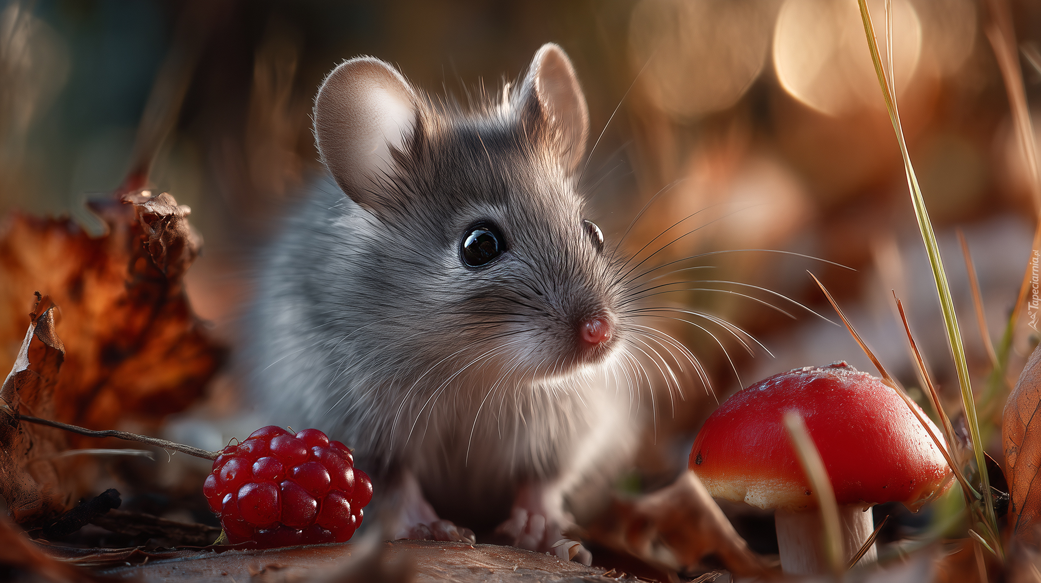 Edytor tapety: Myszka obok maliny i grzyba wśród jesiennych liści