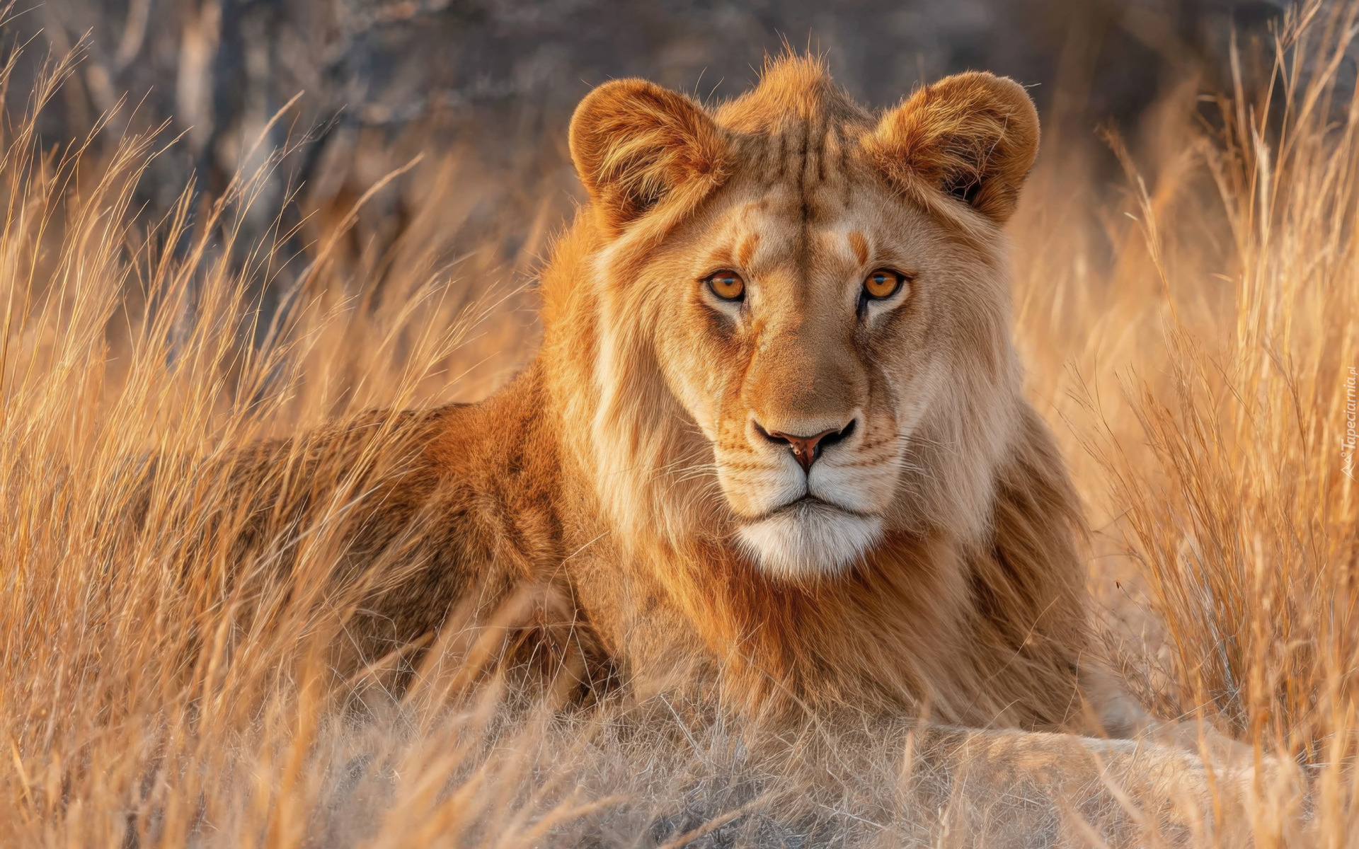 Edytor tapety: Lew leżący w wysokiej suchej trawie
