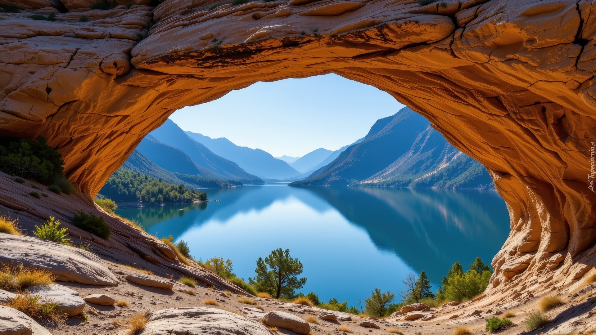 Edytor tapety: Widok zza rozświetlonego skalnego łuku na górskie jezioro