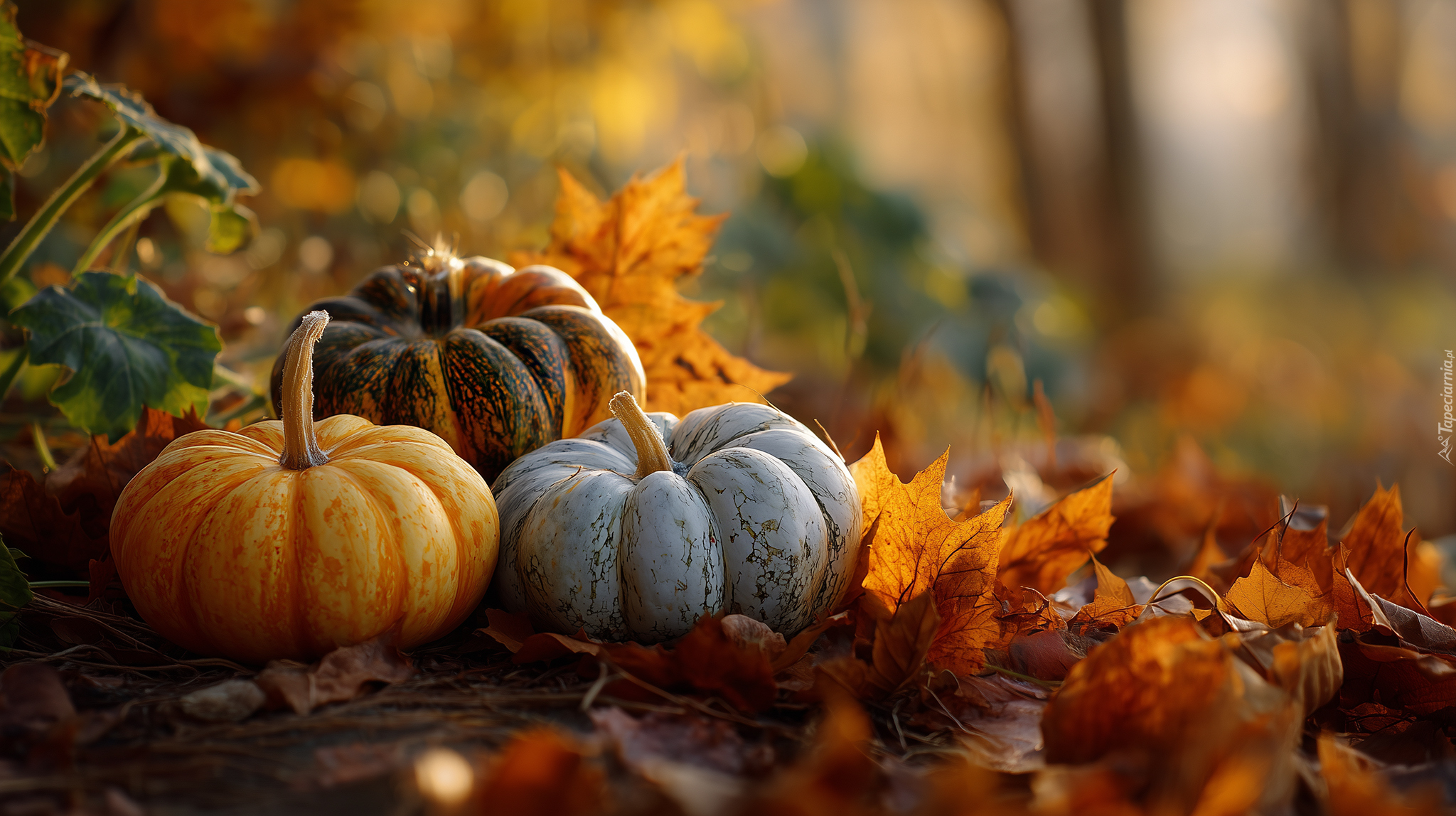 Edytor tapety: Trzy kolorowe dynie na suchych liściach