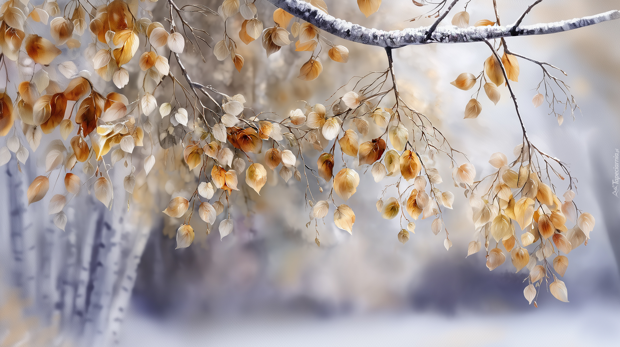 Edytor tapety: Gałązka brzozy z jesiennymi liśćmi na rozmytym tle