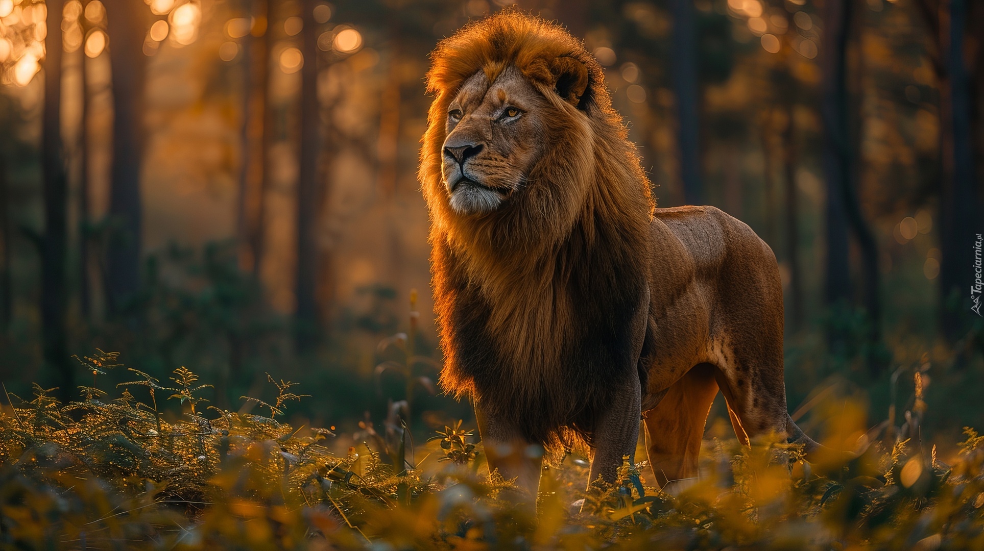 Edytor tapety: Lew stojący w trawie na tle lasu