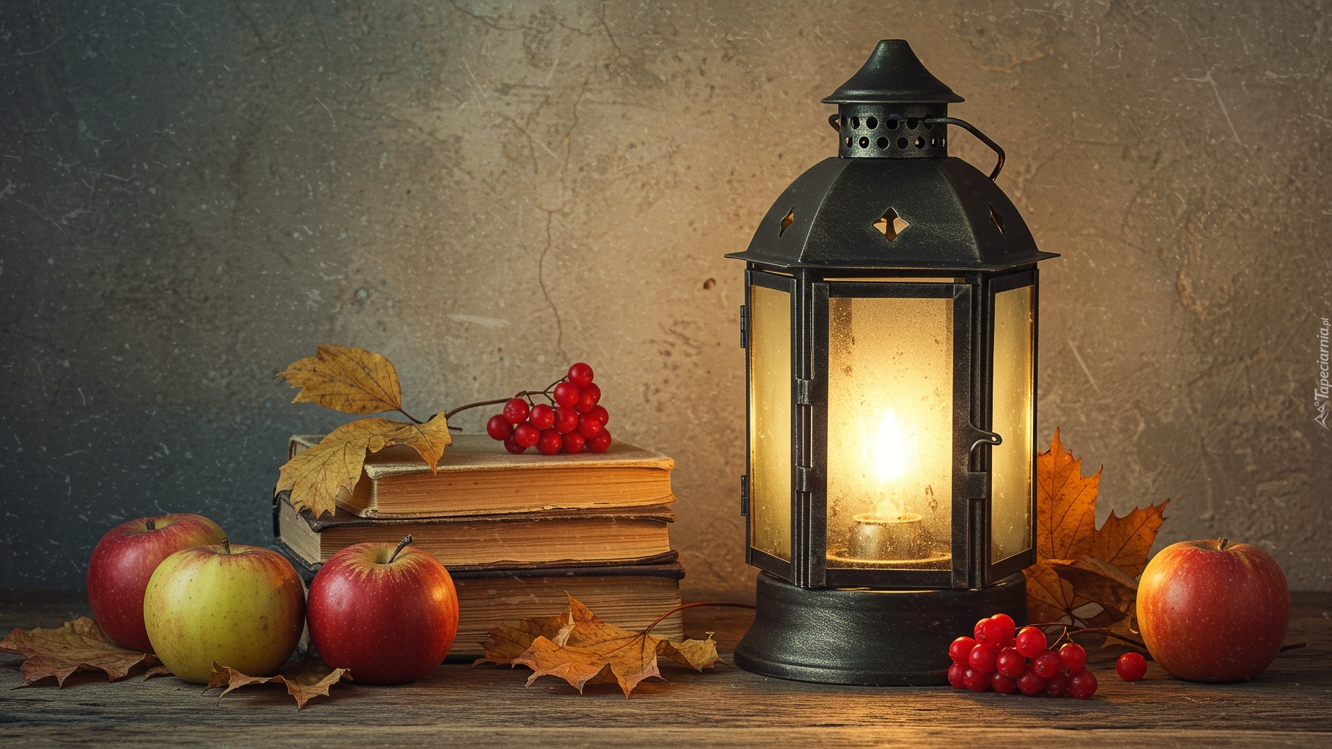 Edytor tapety: Jabłka i książki obok zapalonego lampionu na deskach