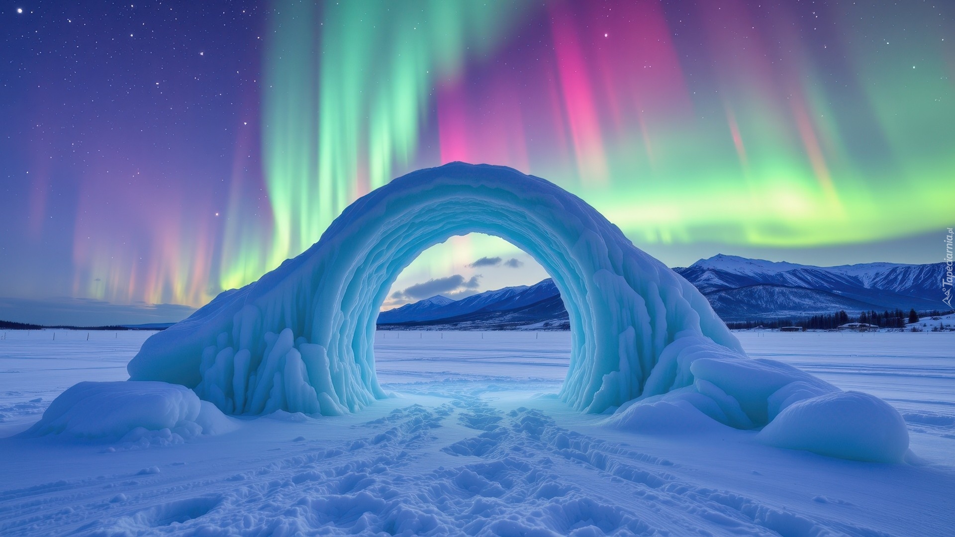 Edytor tapety: Śnieżny łuk na tle zorzy polarnej nad górami