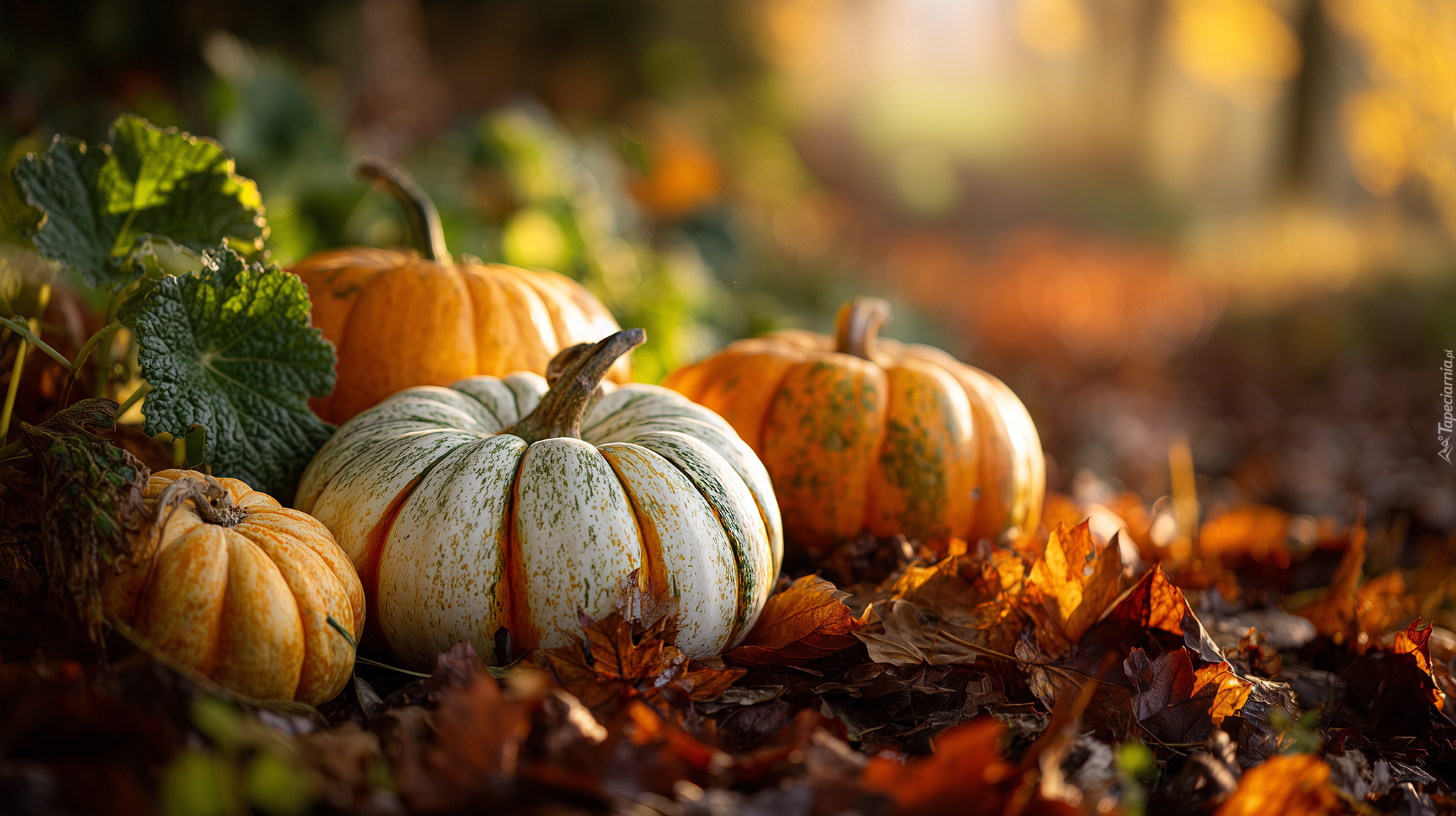 Edytor tapety: Cztery rozświetlone kolorowe dynie na suchych jesiennych liściach
