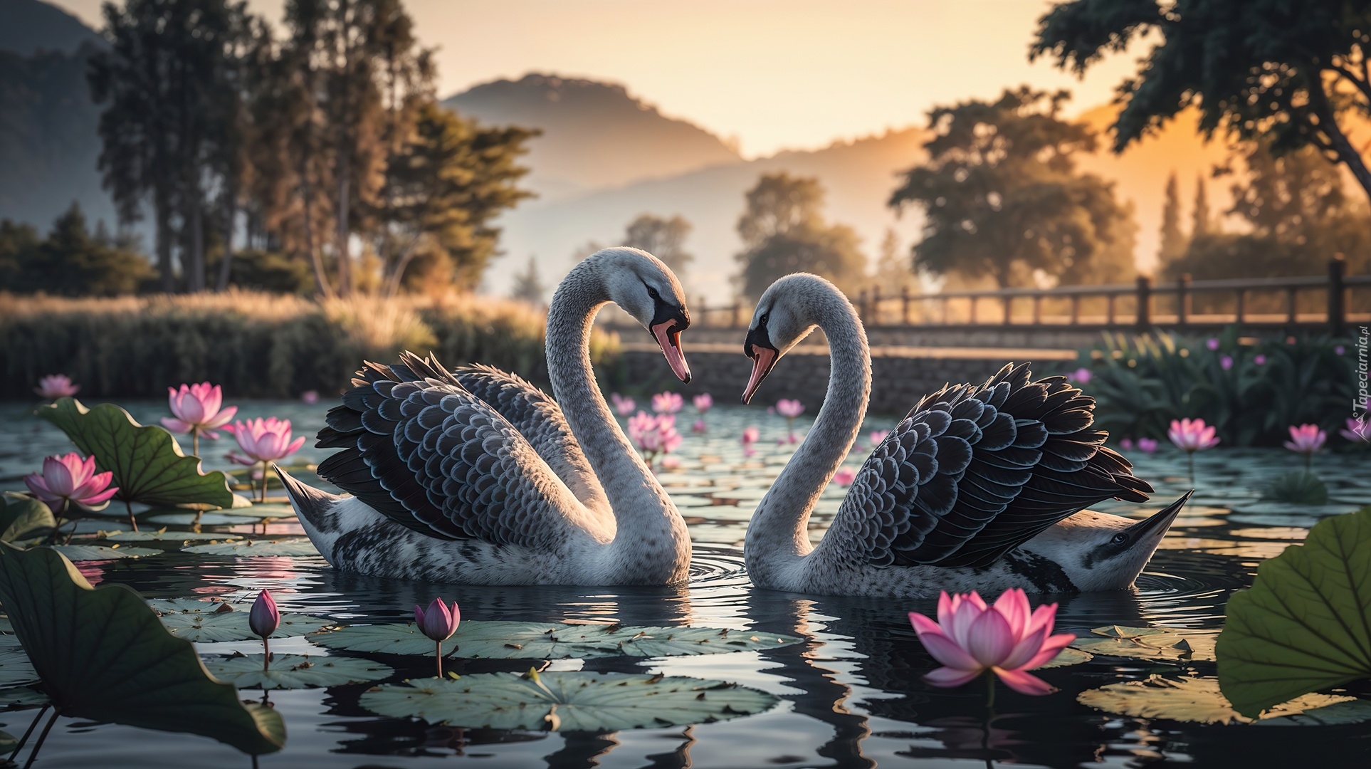 Edytor tapety: Dwa łabędzie i lilie wodne na stawie