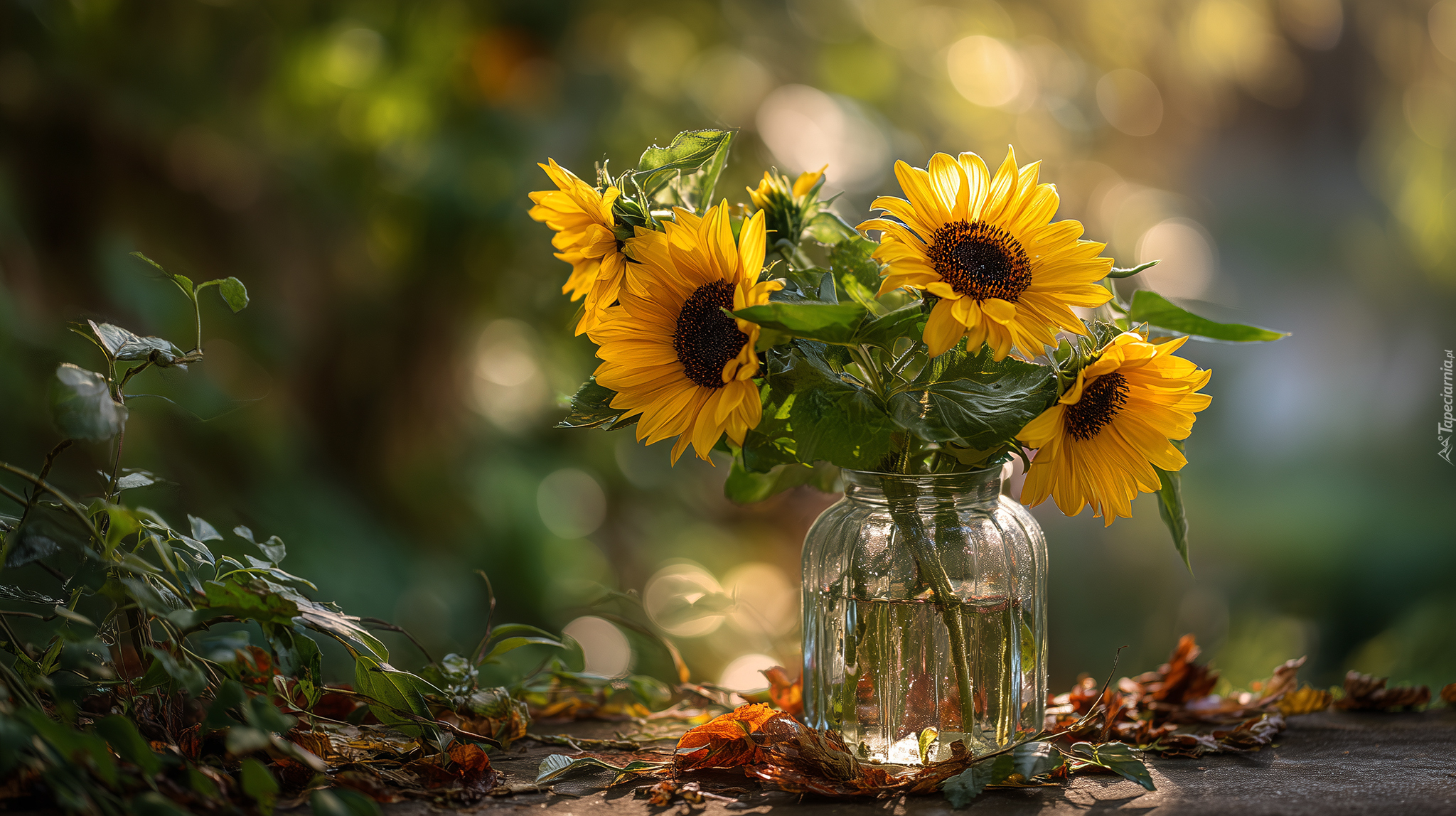 Edytor tapety: Słoneczniki ozdobne w słoiku na jesiennych liściach