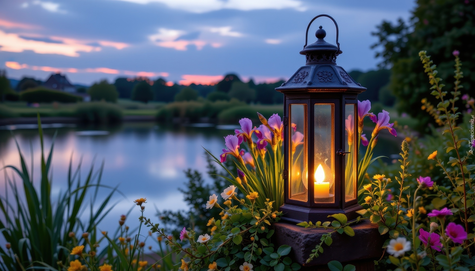 Edytor tapety: Zapalony lampion na kamieniu wśród kwiatów nad stawem
