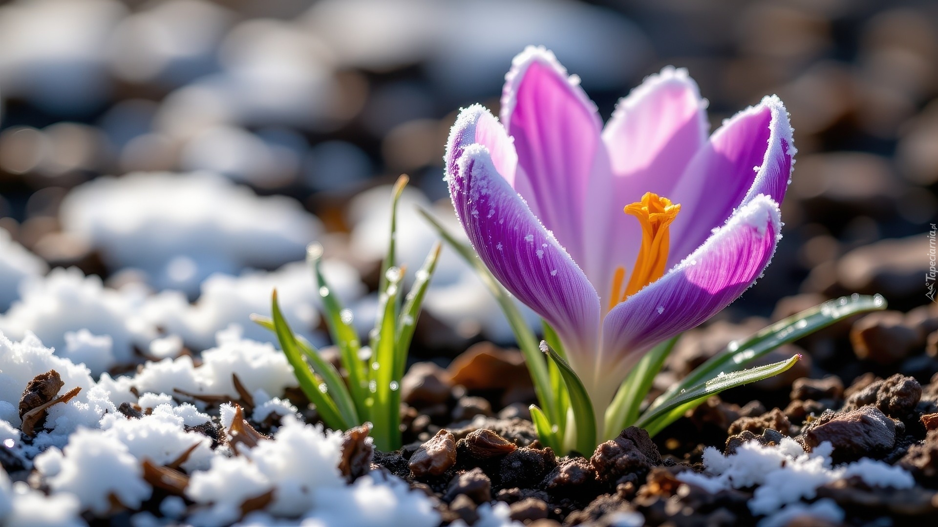 Edytor tapety: Ośnieżony fioletowy krokus w słonecznym blasku