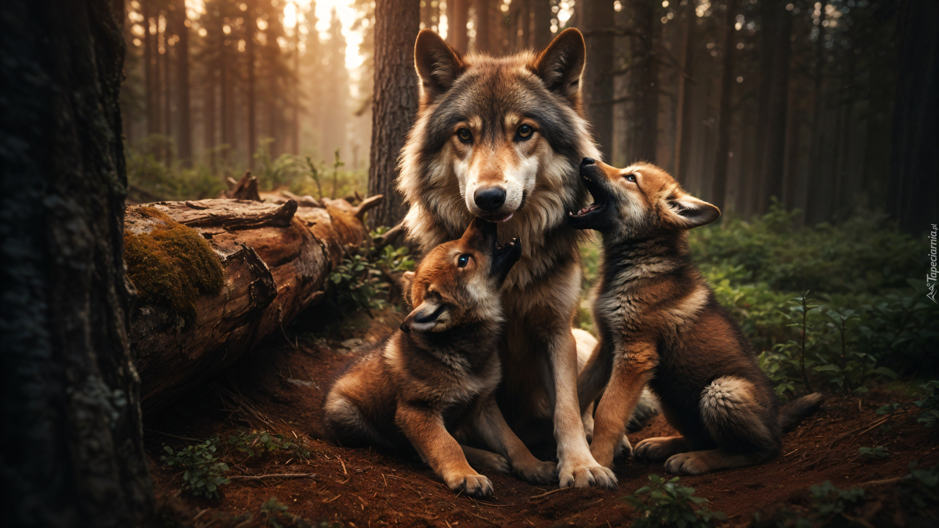 Edytor tapety: Zabawa dwóch wilczków z matką w lesie
