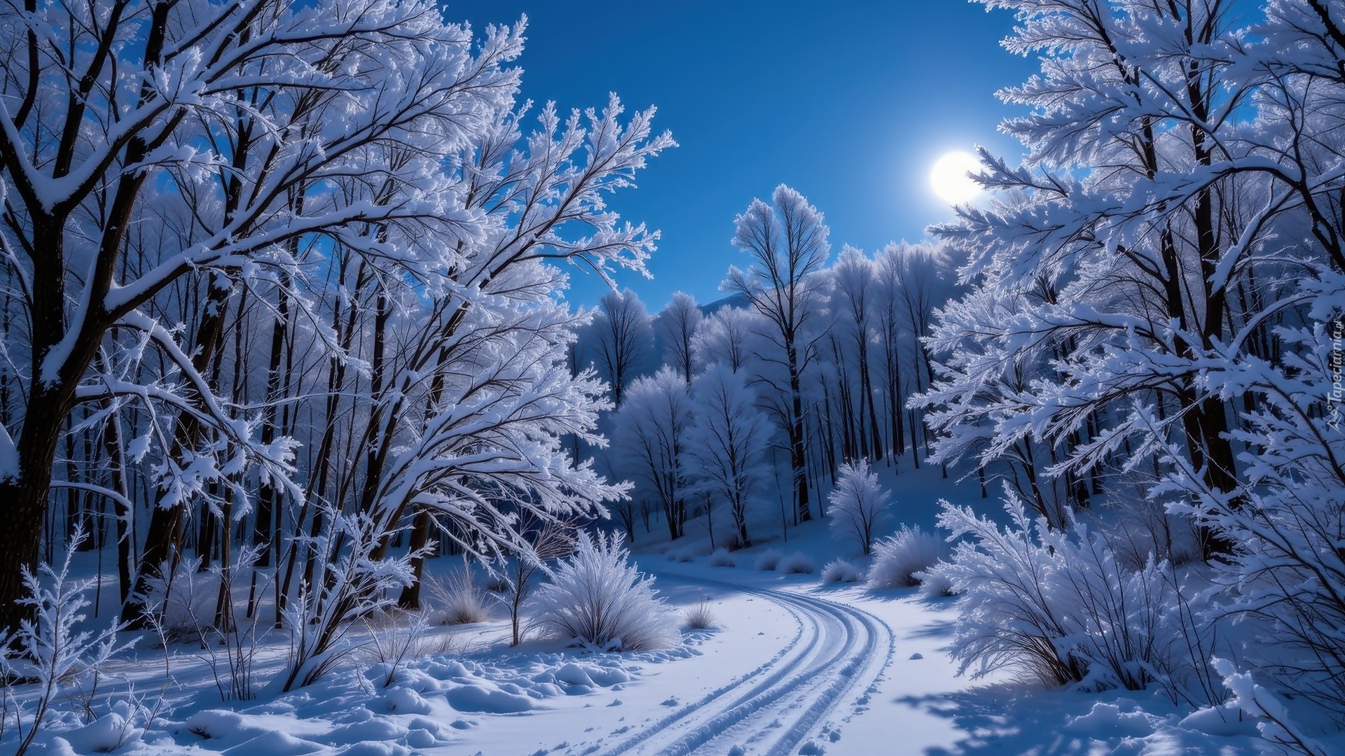Edytor tapety: Ośnieżone drzewa przy drodze w blasku księżyca