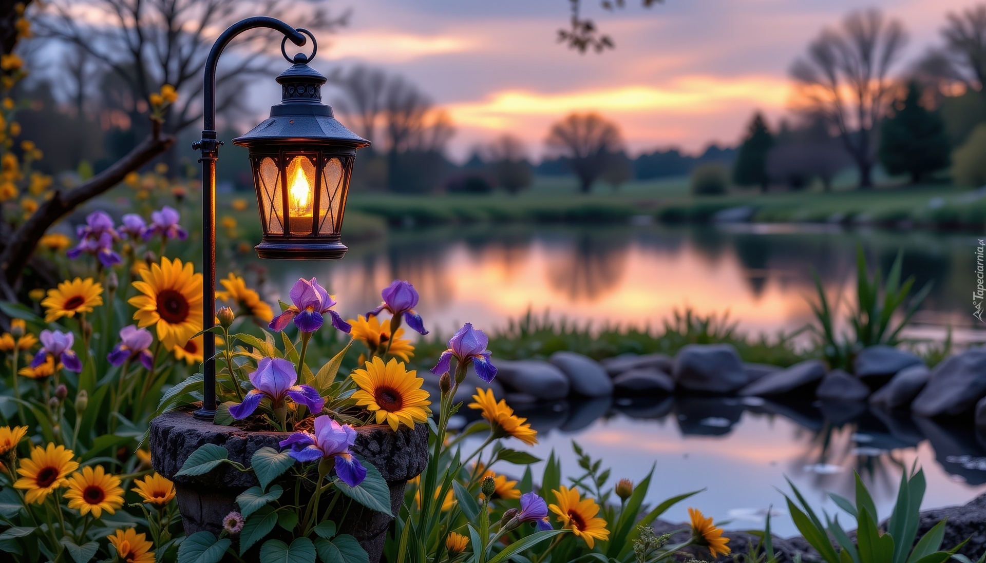 Edytor tapety: Zapalona latarnia wśród kwiatów nad stawem