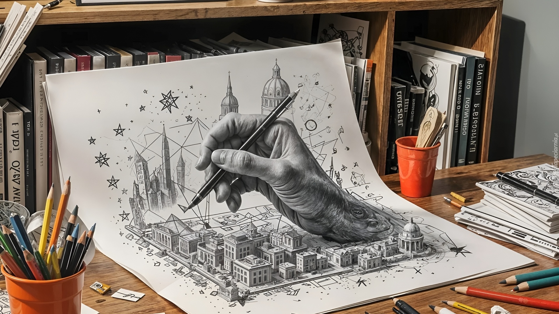 Edytor tapety: Ręka z ołówkiem wystająca z rysunku