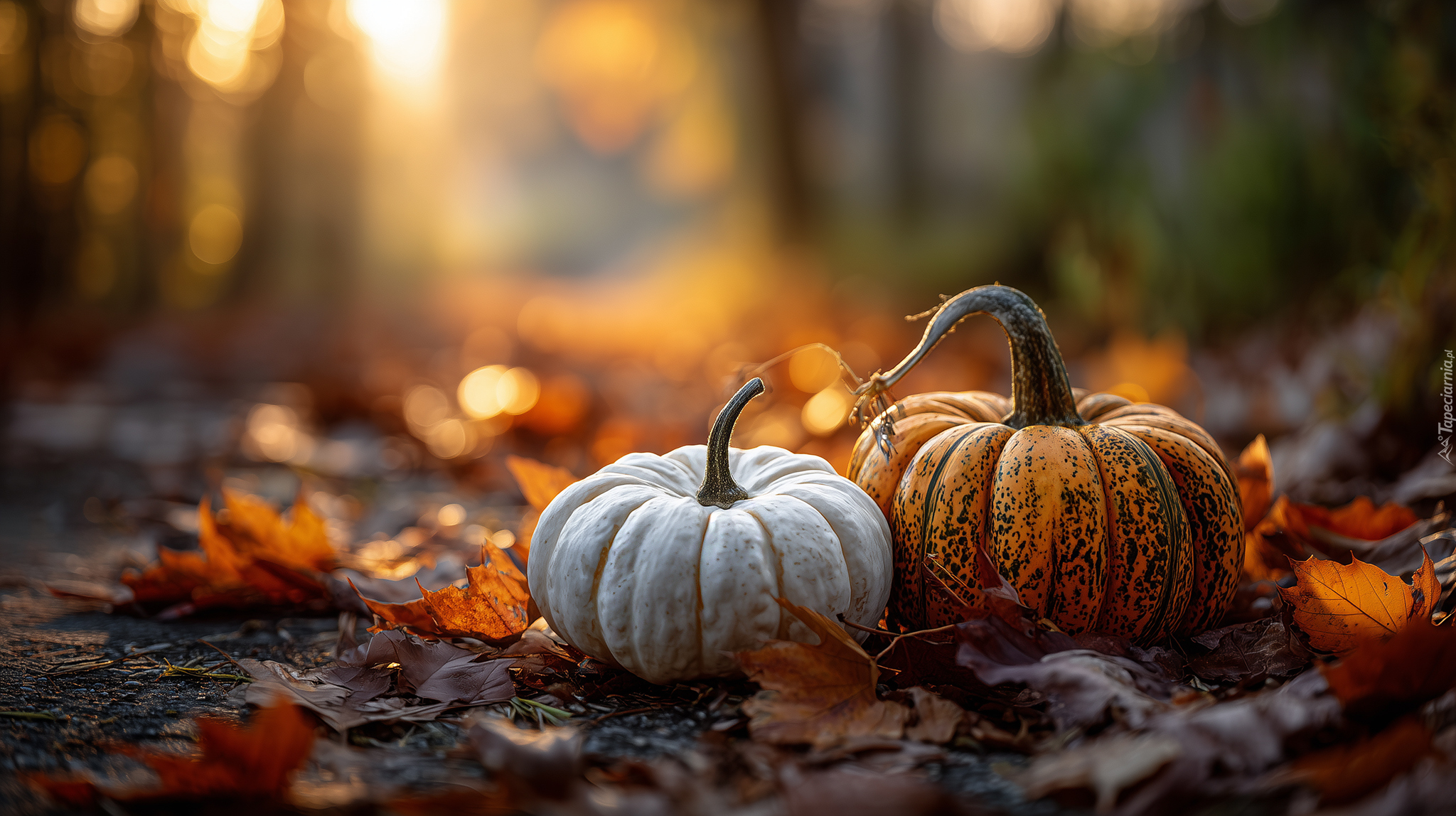 Edytor tapety: Dwie dynie na suchych liściach na rozświetlonym tle