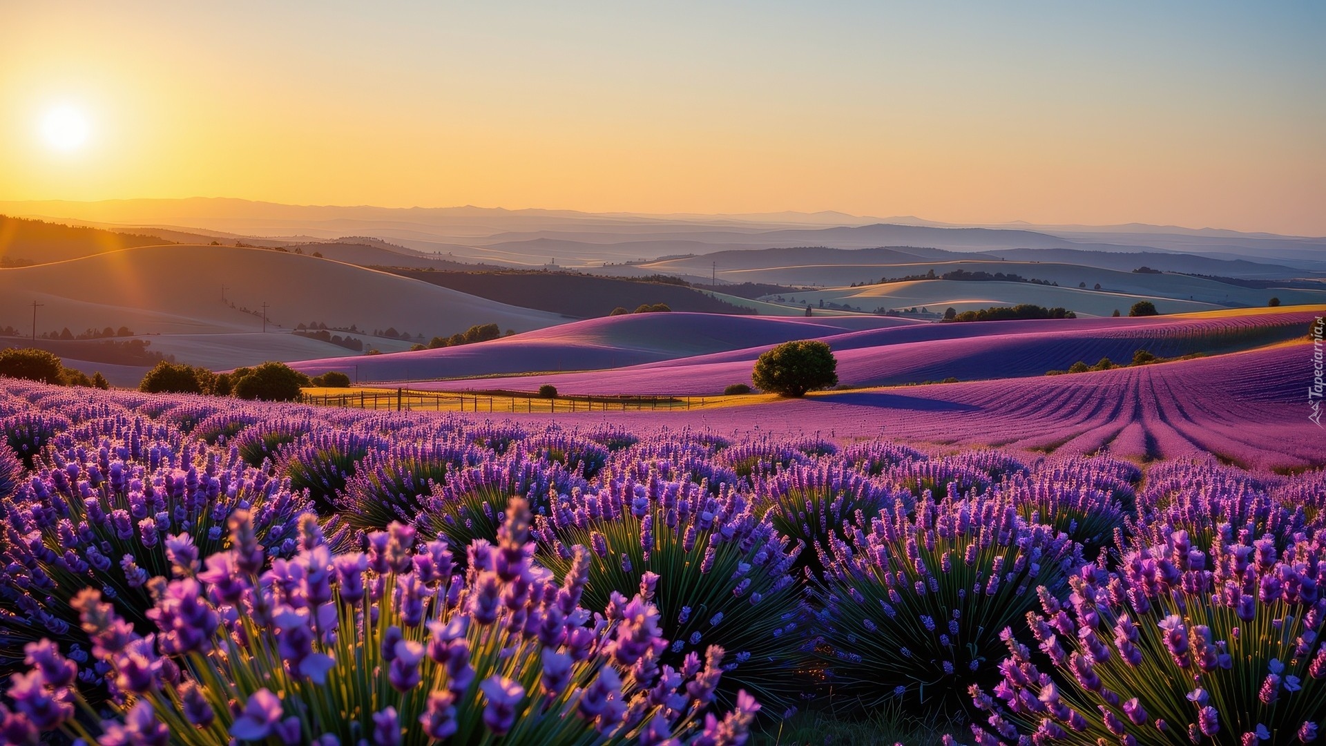 Edytor tapety: Pole lawendy rozświetlone blaskiem wschodzącego słońca nad wzgórzami