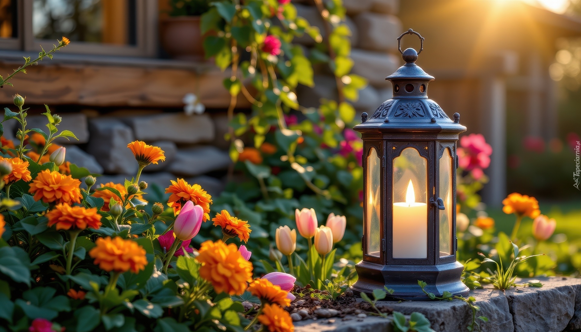 Edytor tapety: Kolorowe kwiaty i zapalony lampion na kamiennym murku