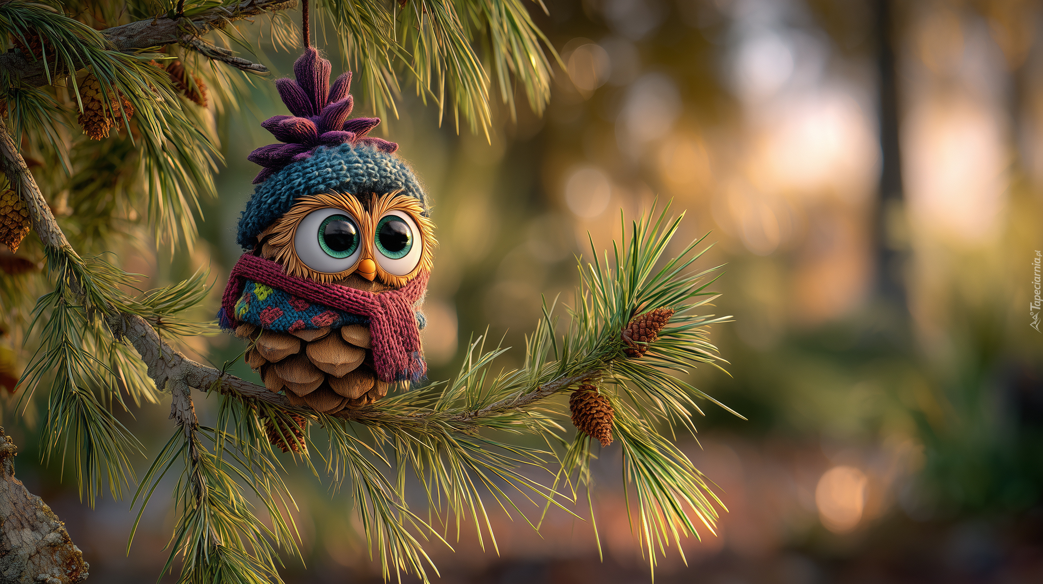 Edytor tapety: Ludzik z szyszki w ubranku na sosnowej gałązce