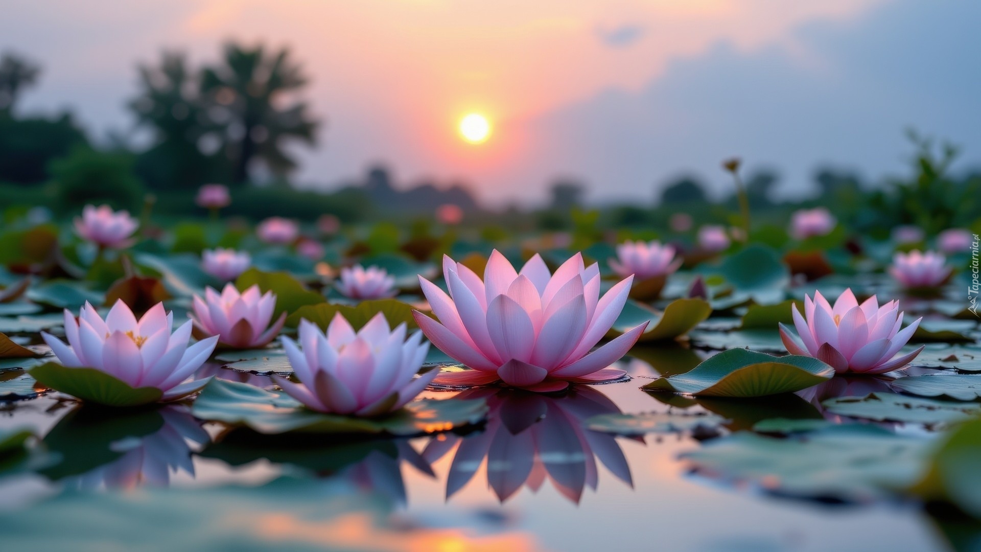 Edytor tapety: Rozświetlone słonecznym blaskiem różowe lilie wodne i liście