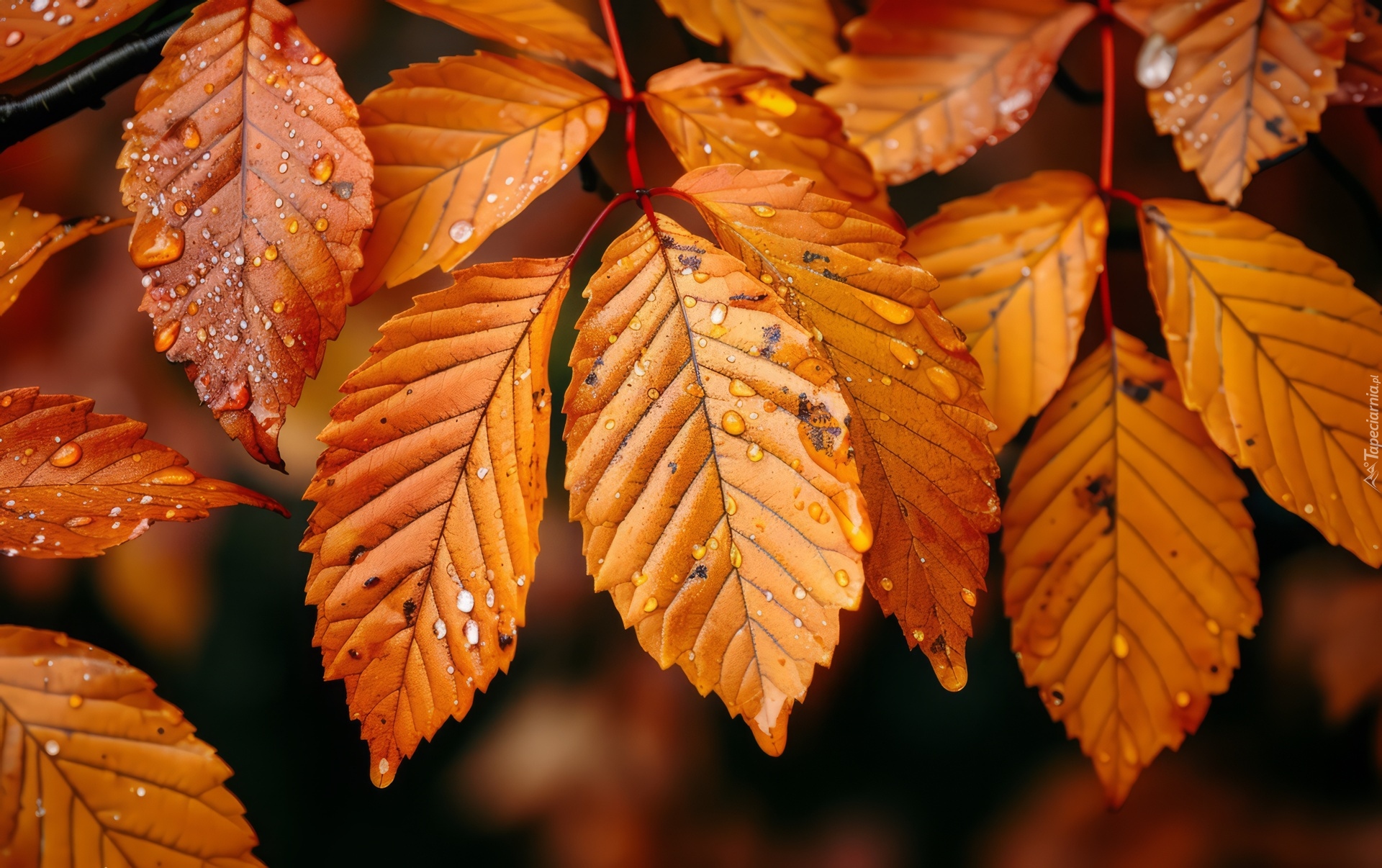 Edytor tapety: Krople na pożółkłych jesiennych liściach w zbliżeniu