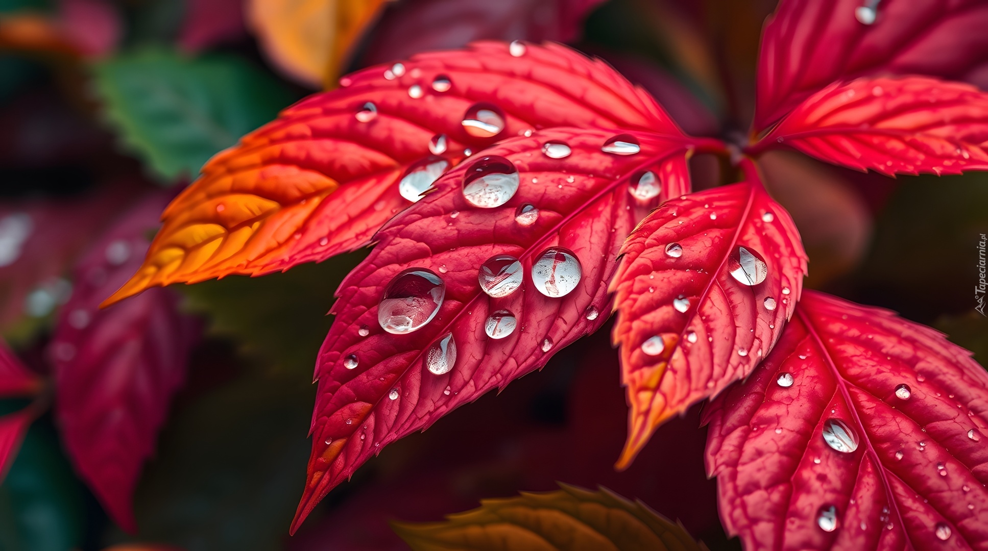Edytor tapety: Krople na czerwonych liściach w zbliżeniu