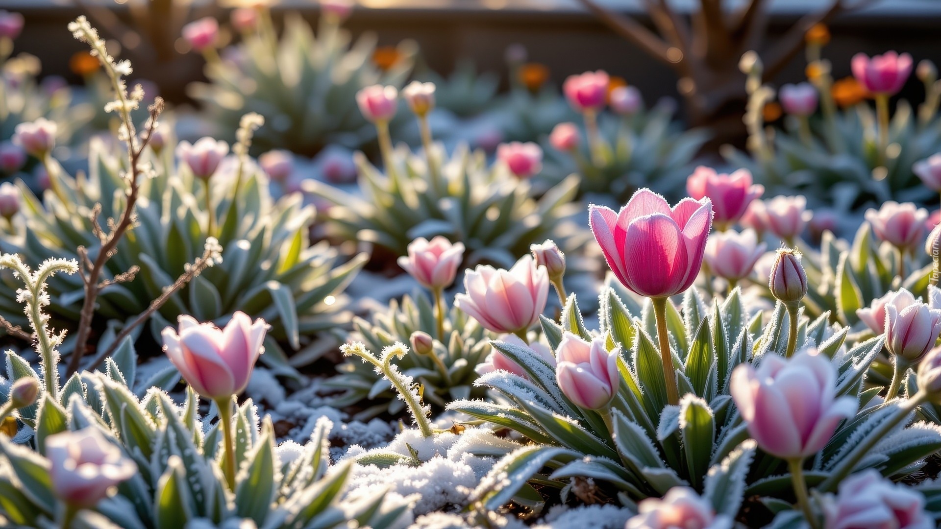 Edytor tapety: Oszronione różowo-białe tulipany w słonecznym blasku