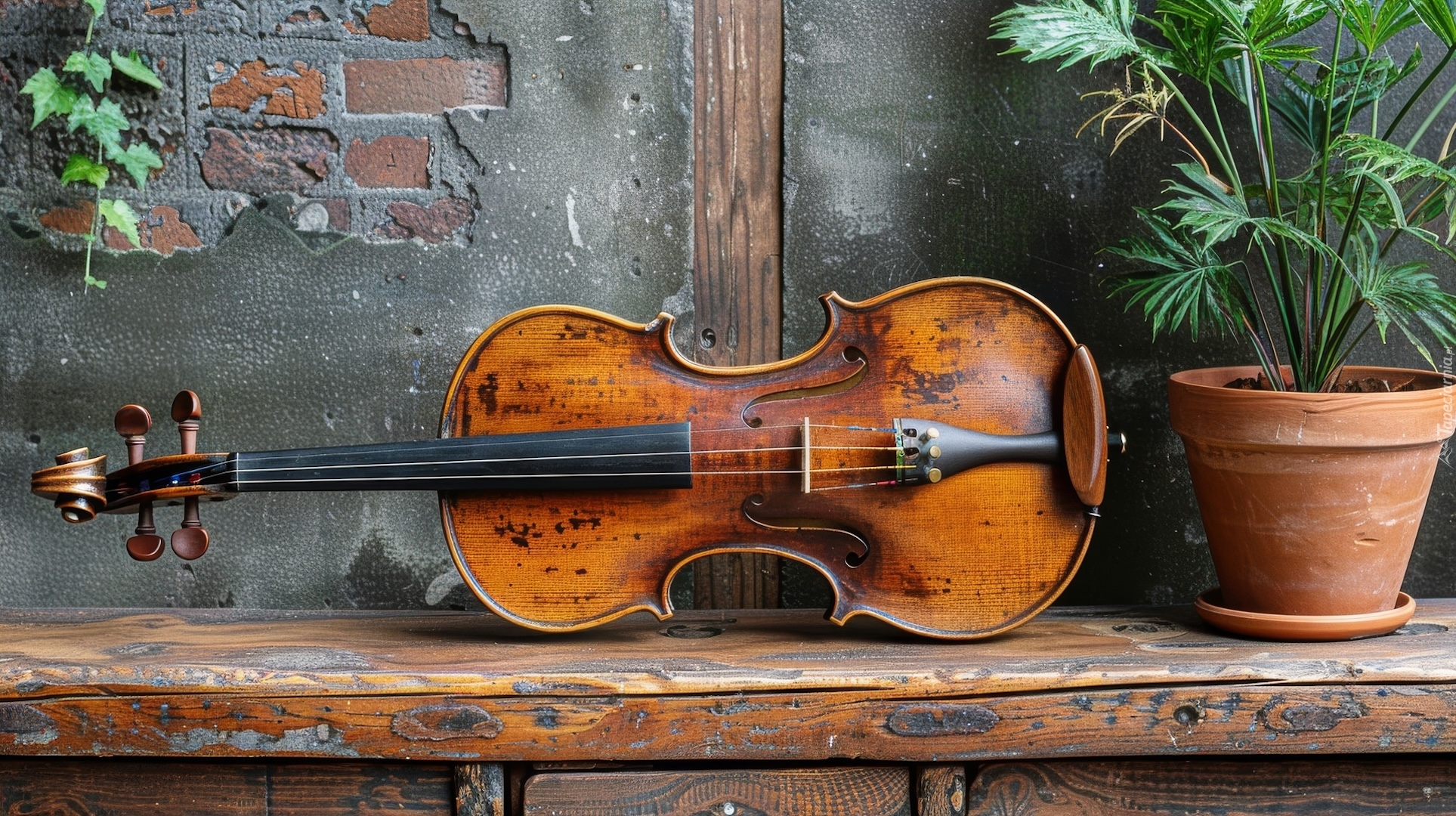 Edytor tapety: Skrzypce obok rośliny w doniczce