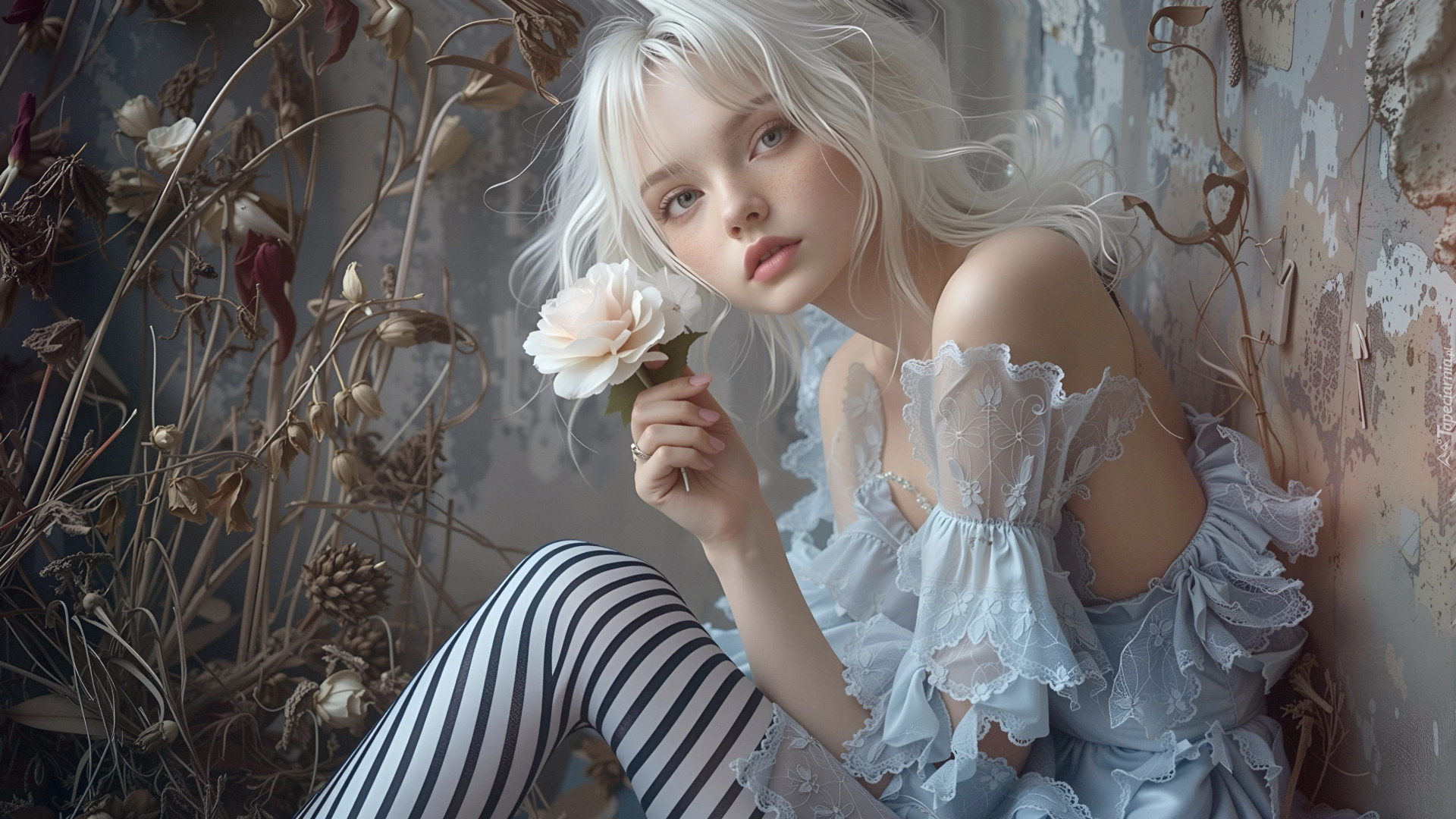 Edytor tapety: Blondynka z różą w ręce siedząca pod ścianą
