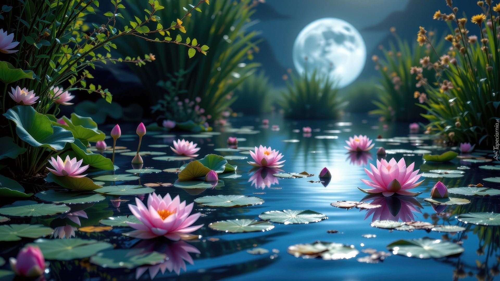 Edytor tapety: Różowe lilie wodne na stawie w blasku księżyca