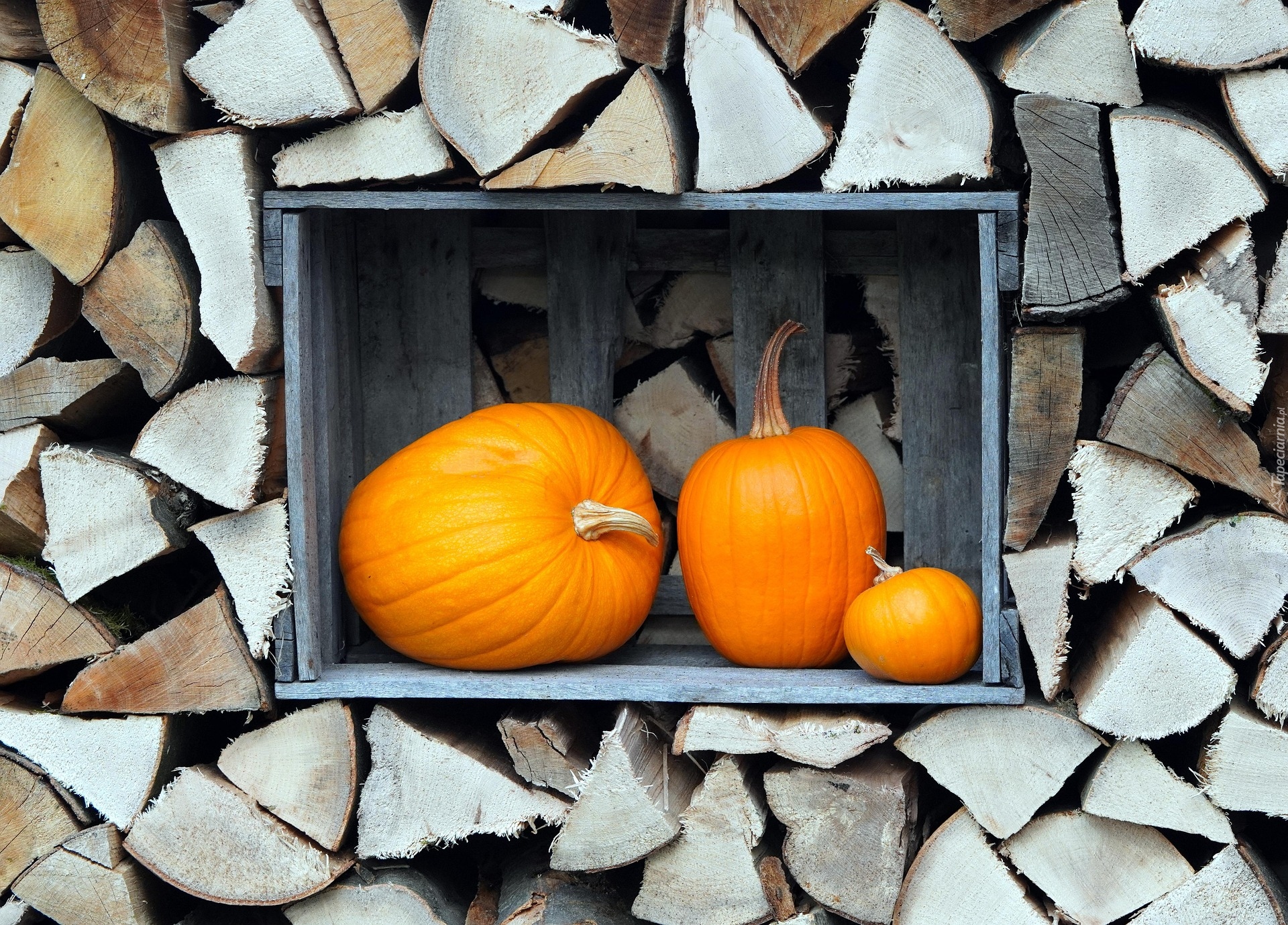 Edytor tapety: Trzy dynie w skrzynce wśród pociętych klocków drzewa
