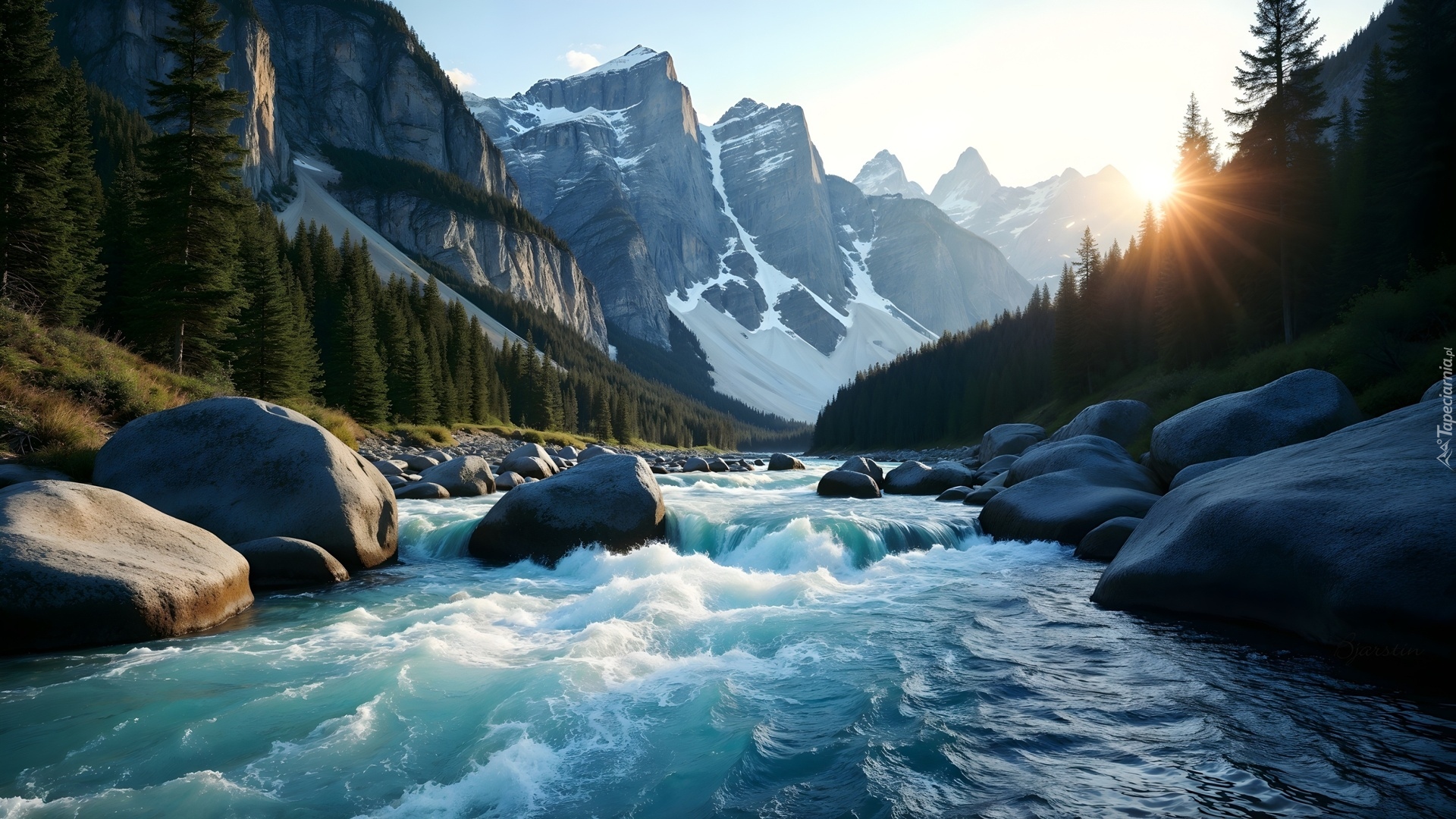 Edytor tapety: Kamienie w rwącej górskiej rzece w promieniach słońca