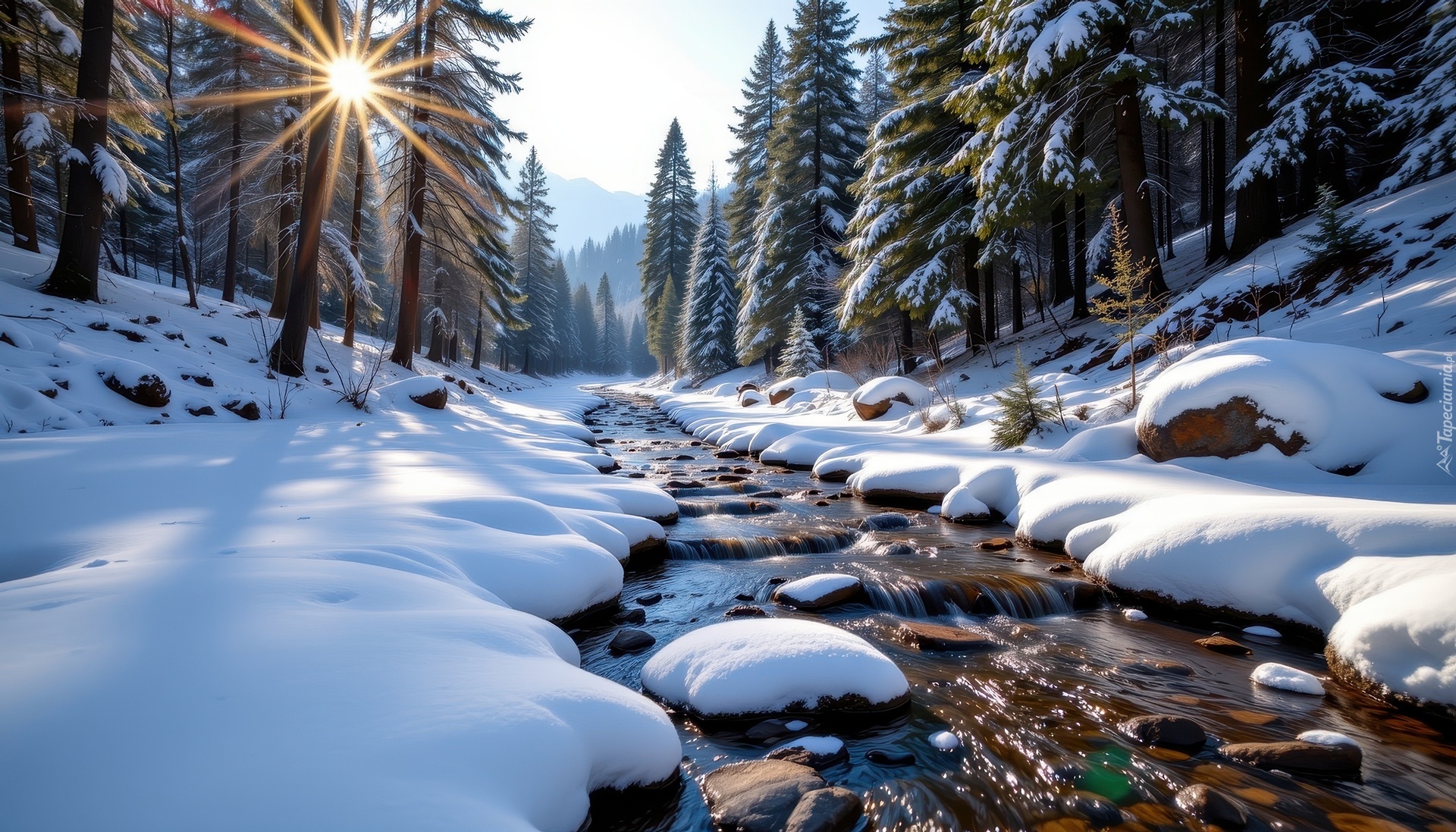 Edytor tapety: Rzeka płynąca wśród iglastych drzew w zimowym lesie