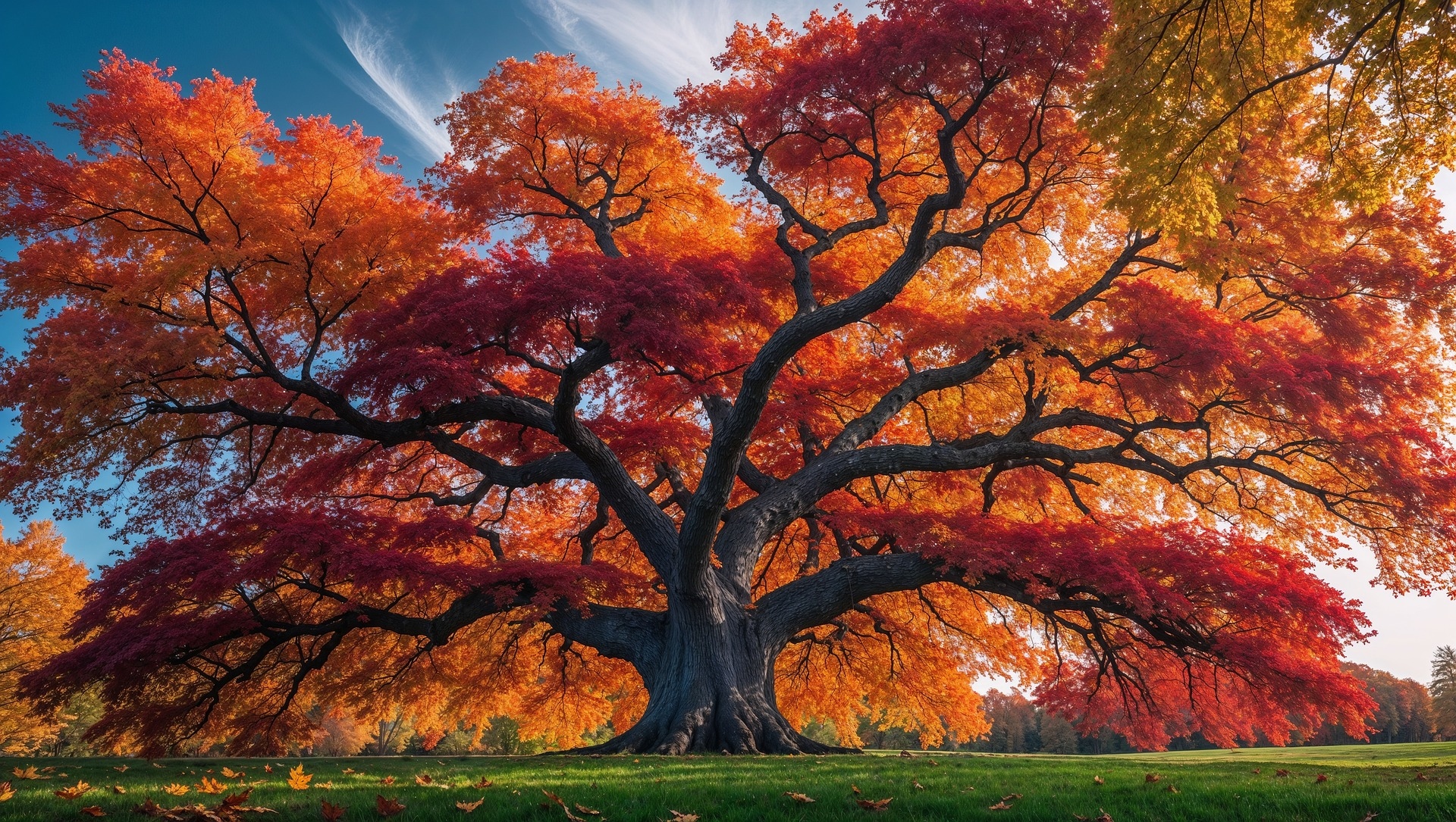 Edytor tapety: Rozłożysty klon z jesiennymi liśćmi w słonecznym blasku