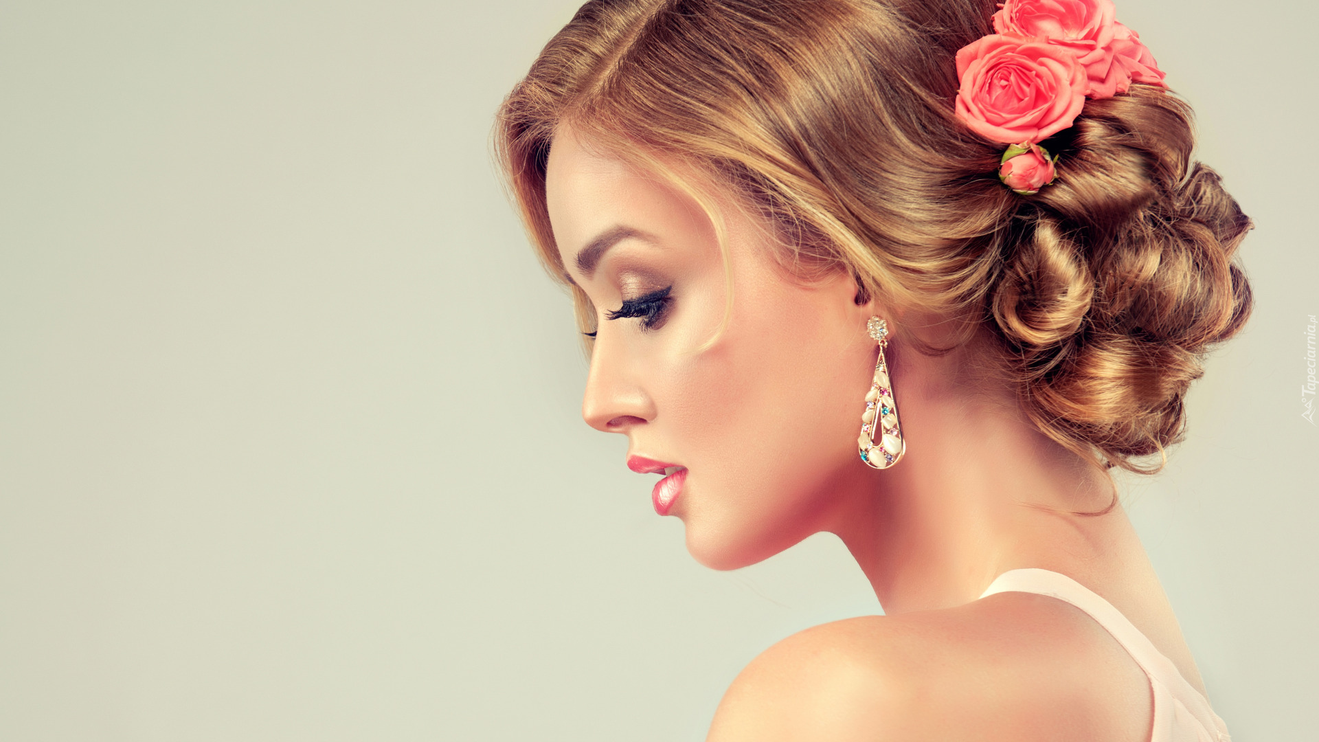 Edytor tapety: Profil twarzy kobiety z różami w upiętych włosach