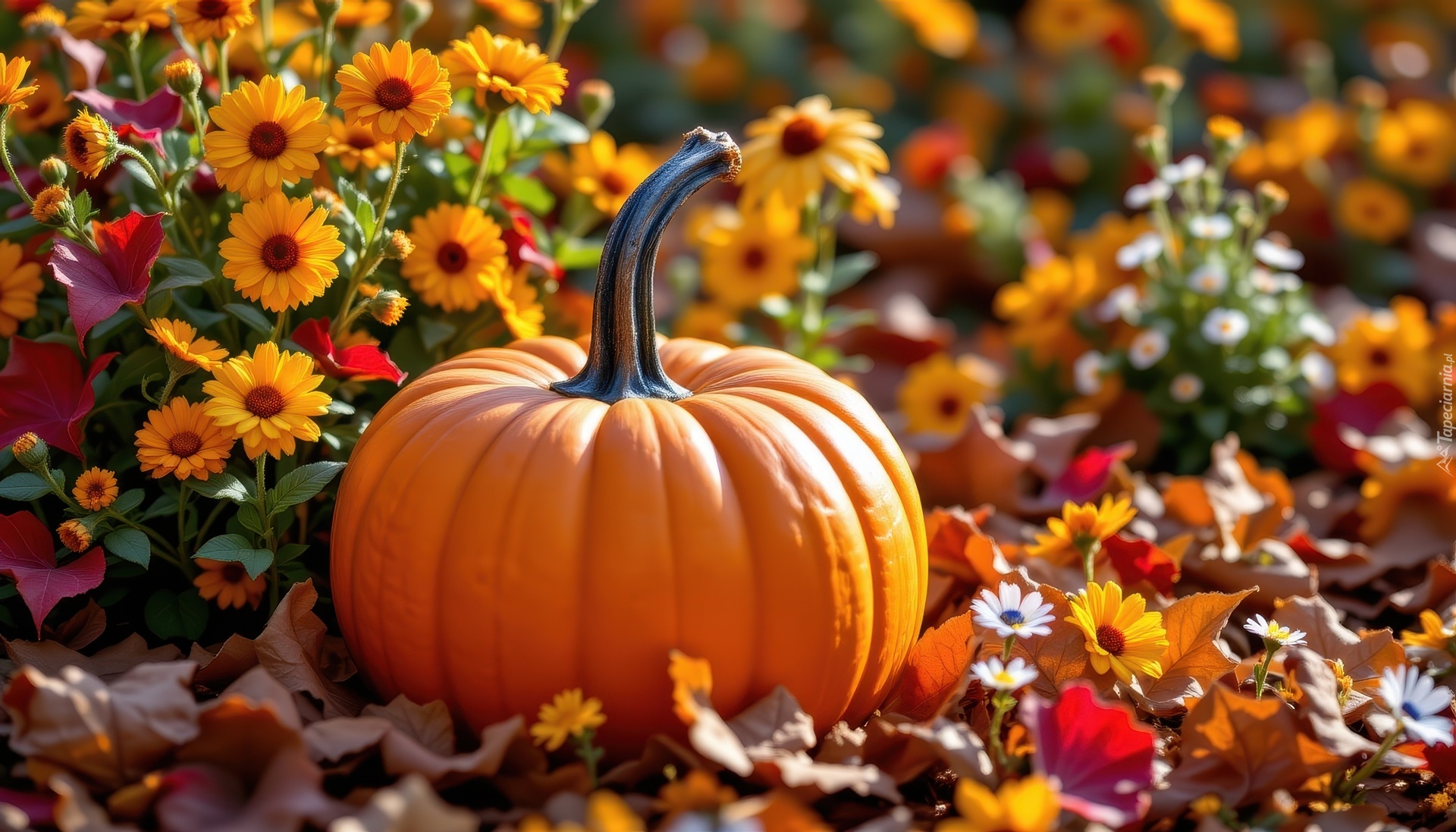 Edytor tapety: Dynia obok pomarańczowych kwiatów w grafice AI
