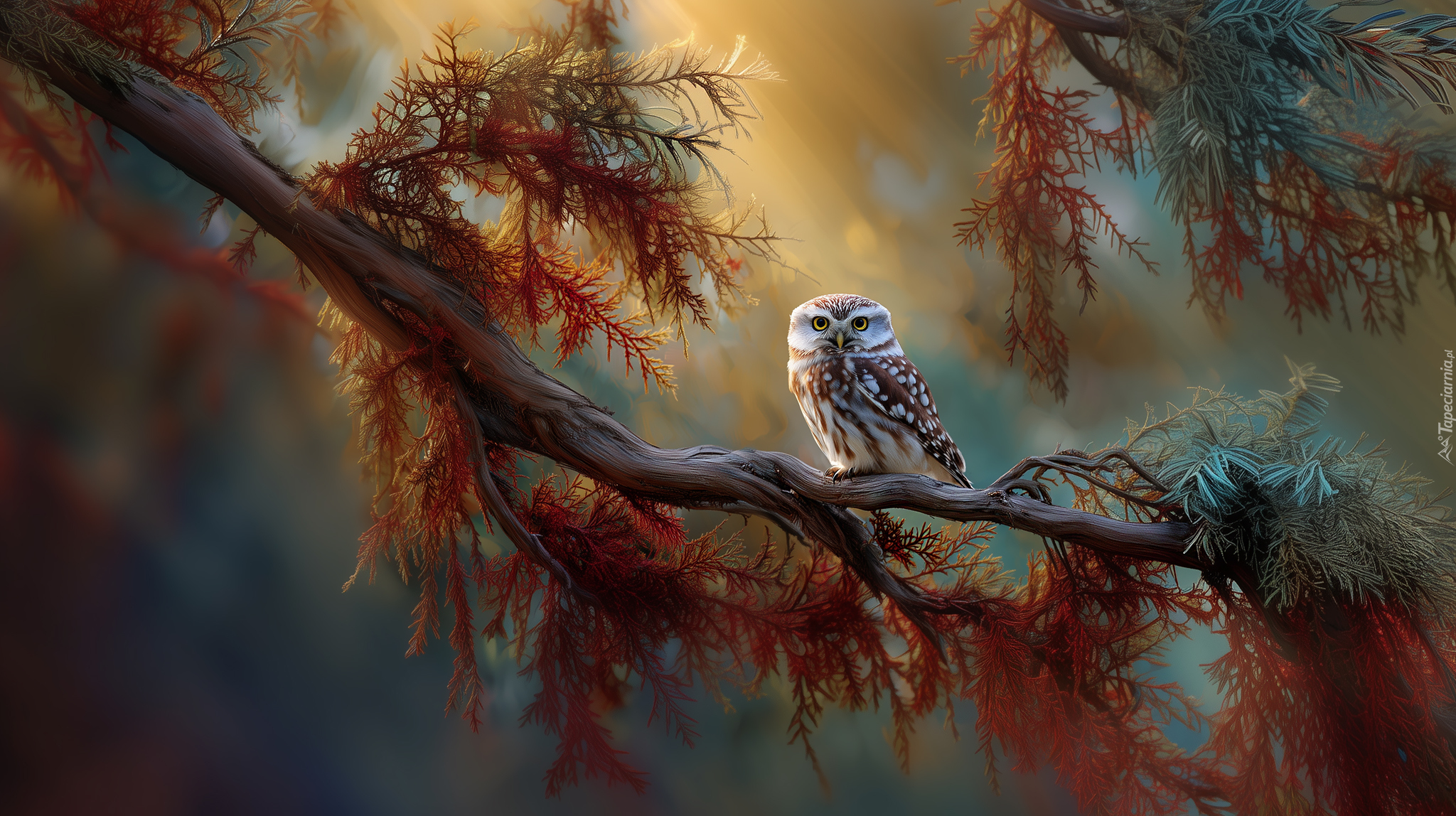 Edytor tapety: Sowa na gałązce drzewa iglastego