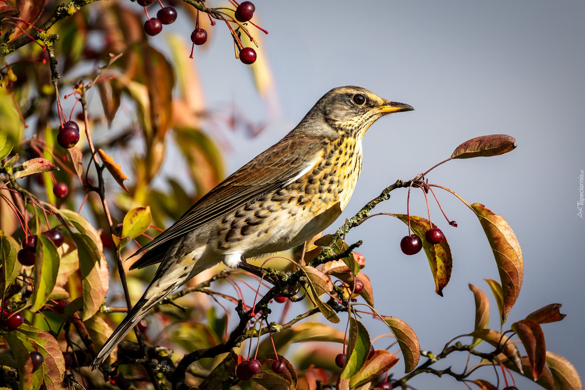 Edytor tapety: Kwiczoł na gałązce z owocami i jesiennymi liśćmi