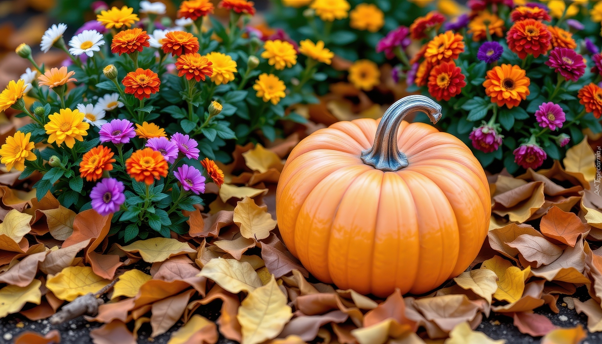 Edytor tapety: Dynia na jesiennych liściach obok kolorowych kwiatów