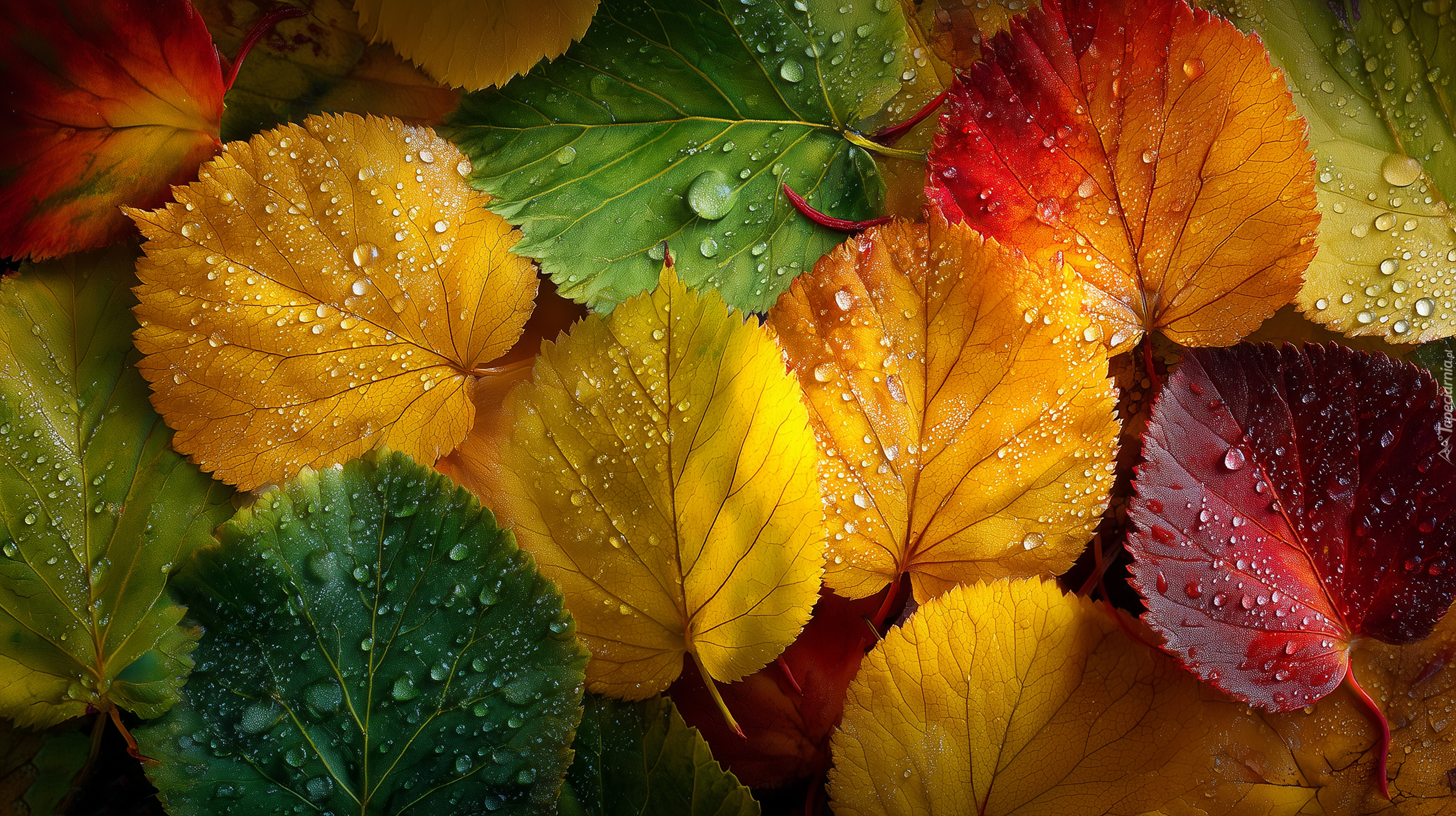 Edytor tapety: Krople na kolorowych jesiennych liściach w zbliżeniu