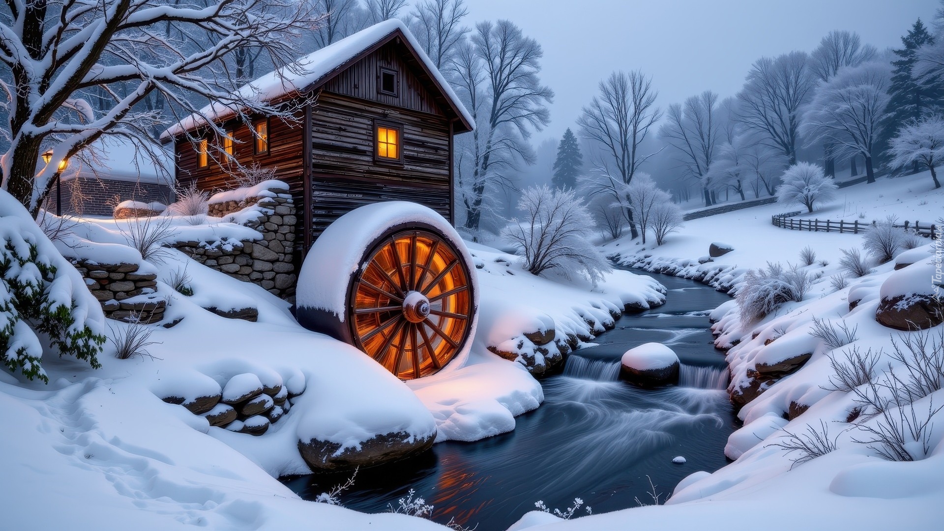 Edytor tapety: Oświetlony młyn wodny oraz ośnieżone drzewa nad rzeką