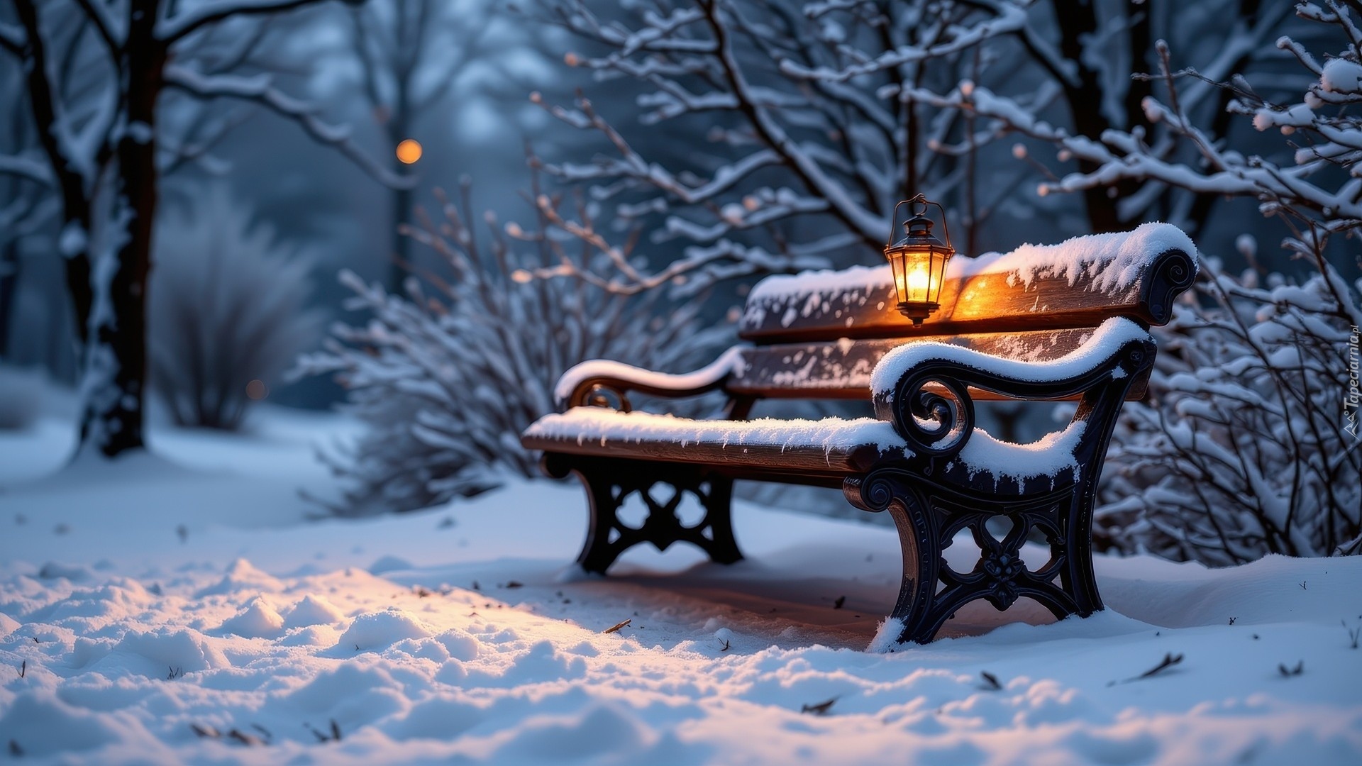 Edytor tapety: Lampion na ośnieżonej ławce pod drzewami