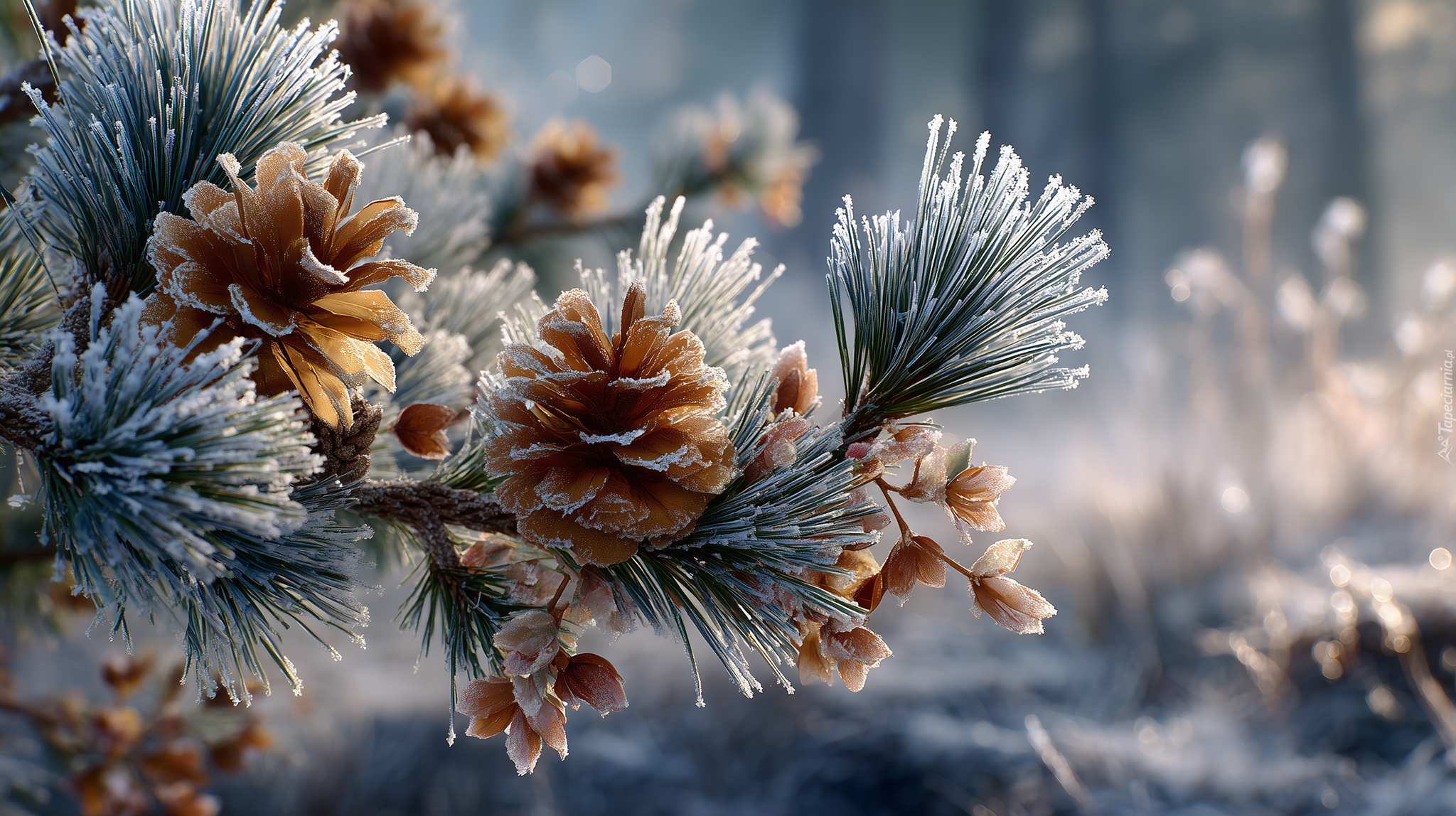Edytor tapety: Dwie szyszki na oszronionej sosnowej gałązce