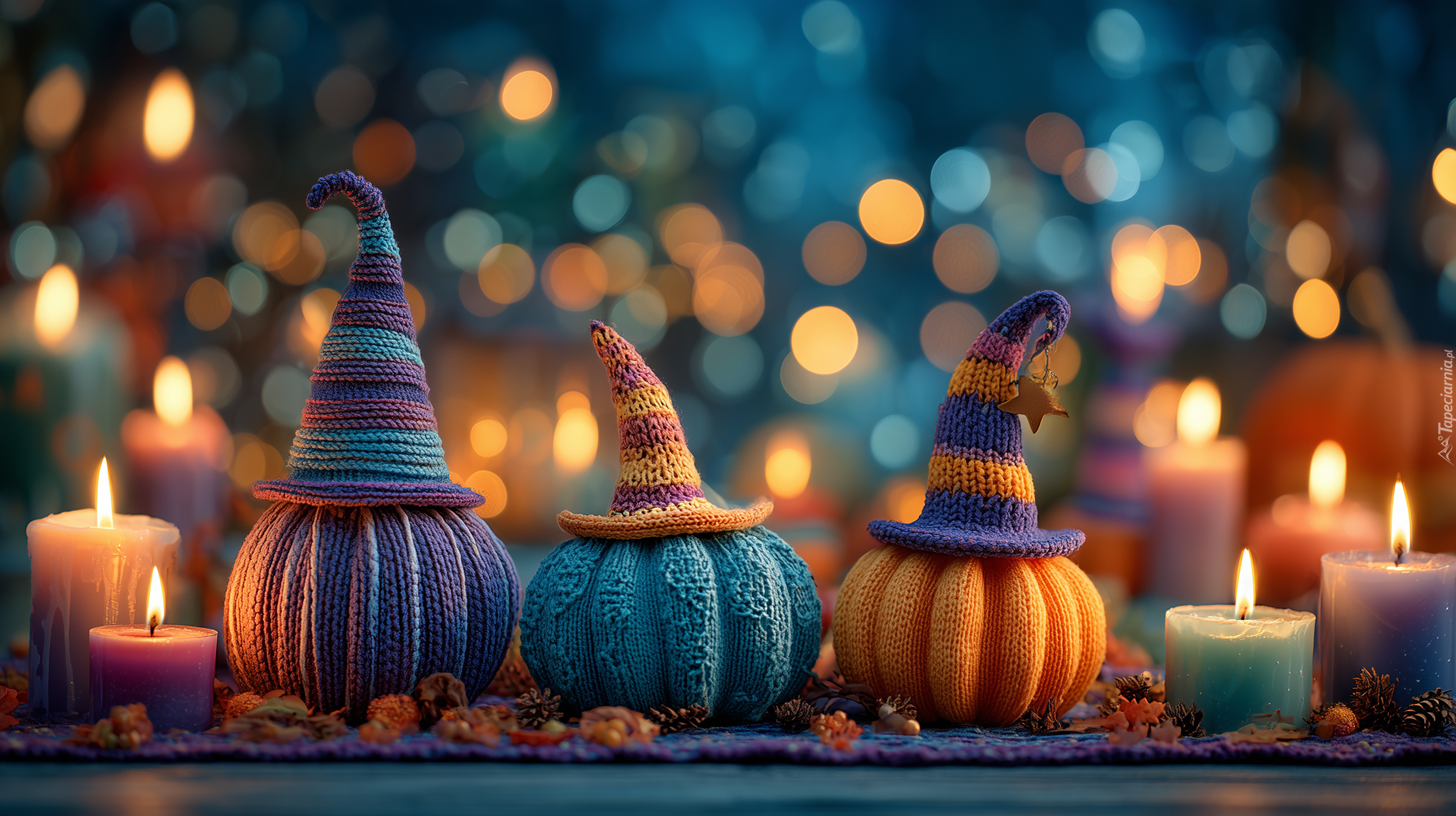 Edytor tapety: Trzy wełniane dynie w czapkach obok zapalonych świec