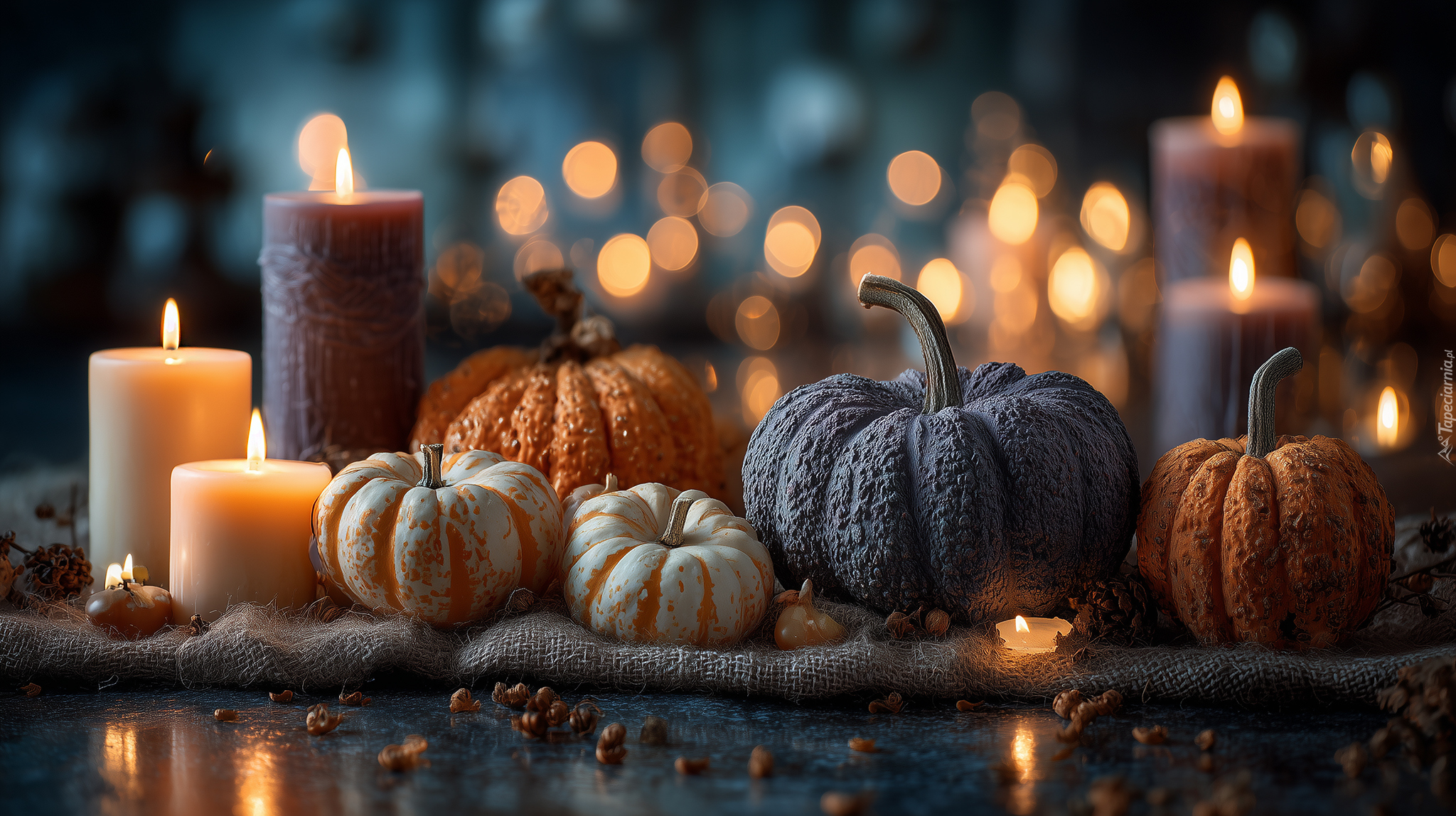 Edytor tapety: Zapalone świece obok dyń leżących na tkaninie