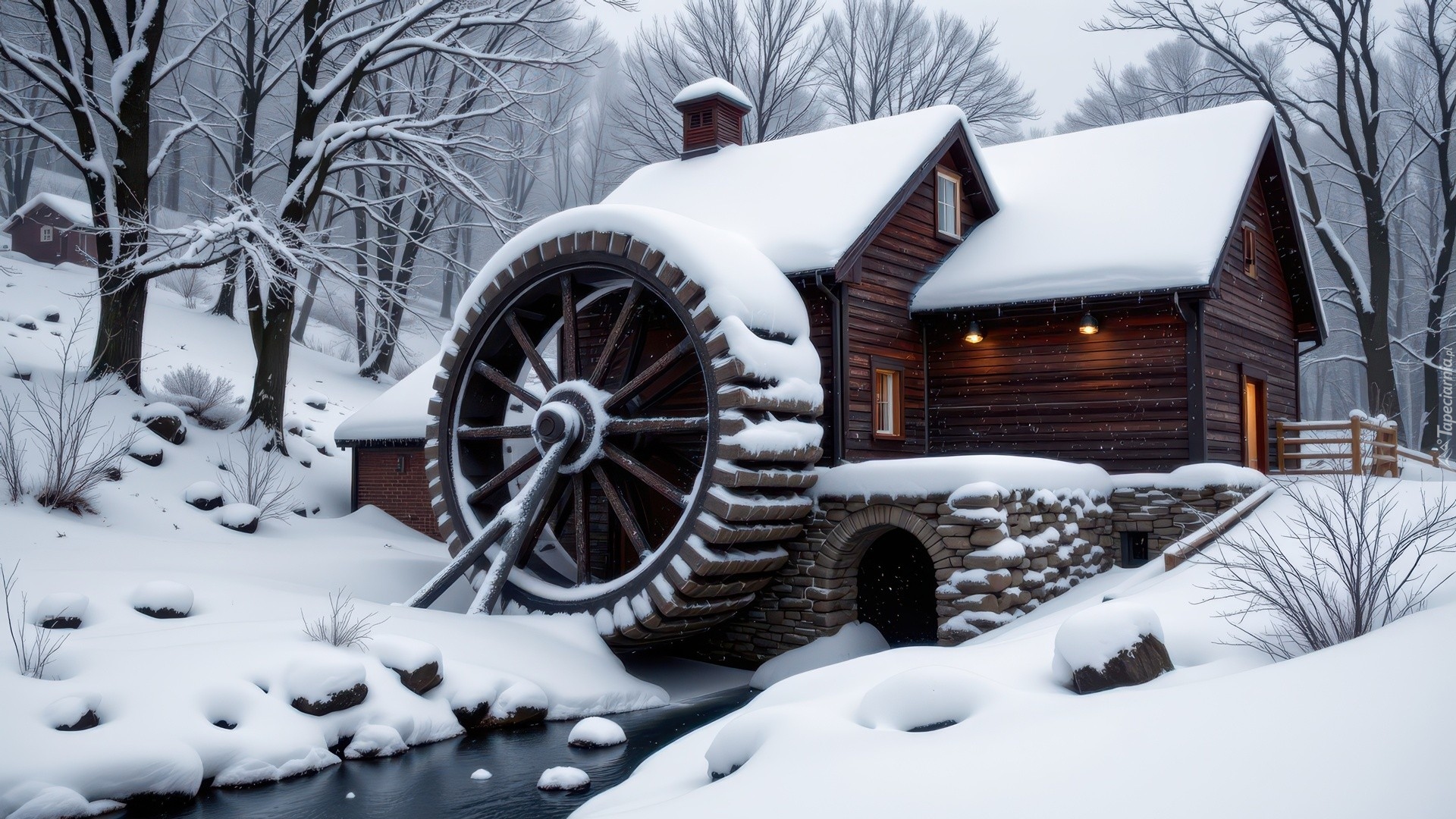 Edytor tapety: Ośnieżone drzewa i młyn wodny nad rzeką
