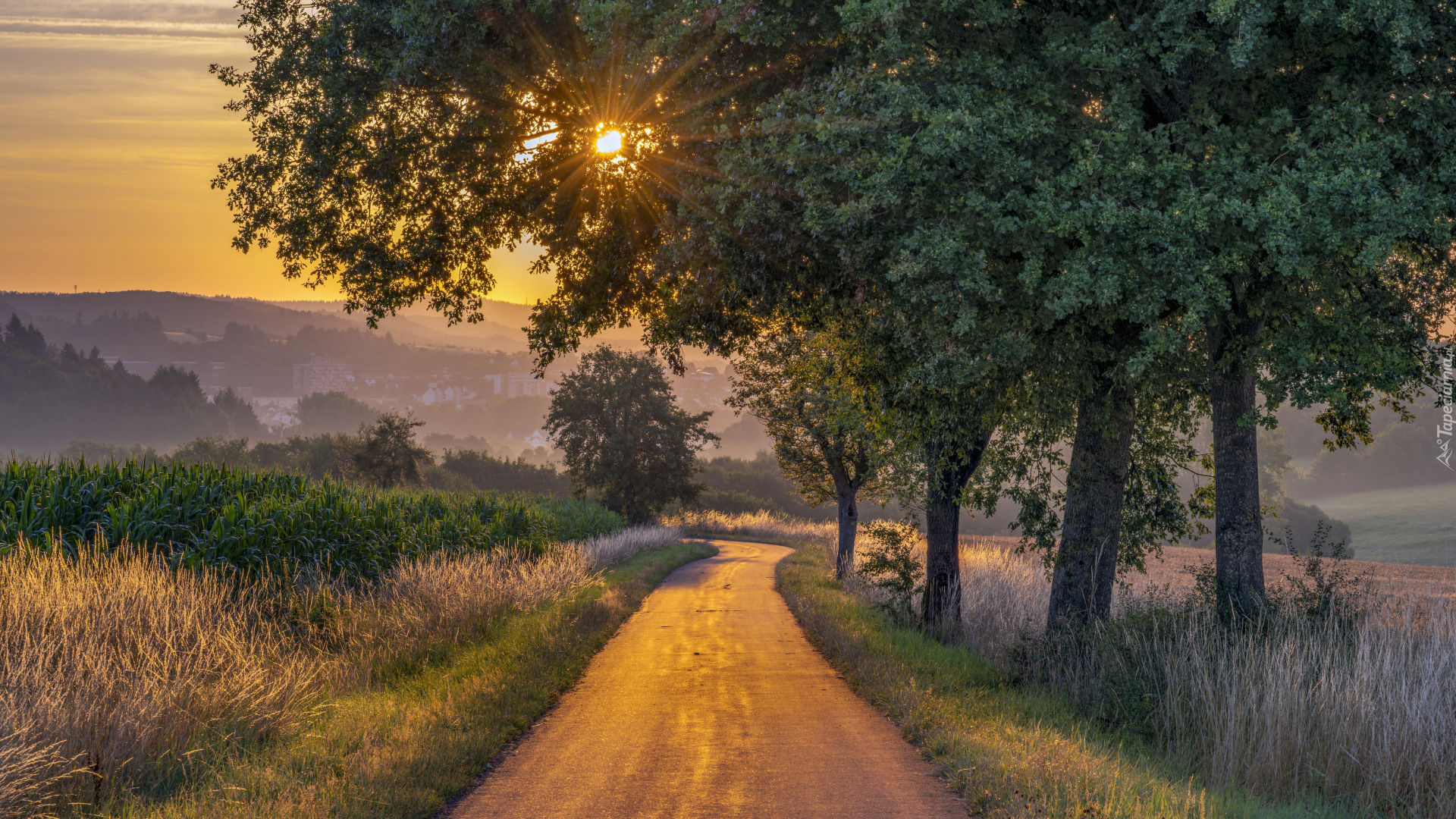 Edytor tapety: Promienie zachodzącego słońca w gałęziach drzew przy drodze