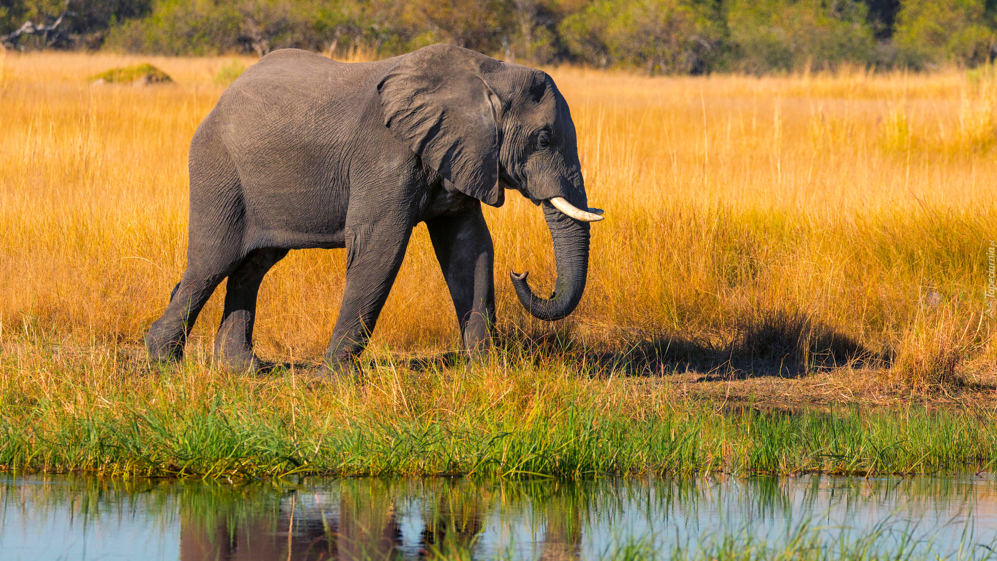 Edytor tapety: Słoń idący wśród pożółkłych traw nad wodą