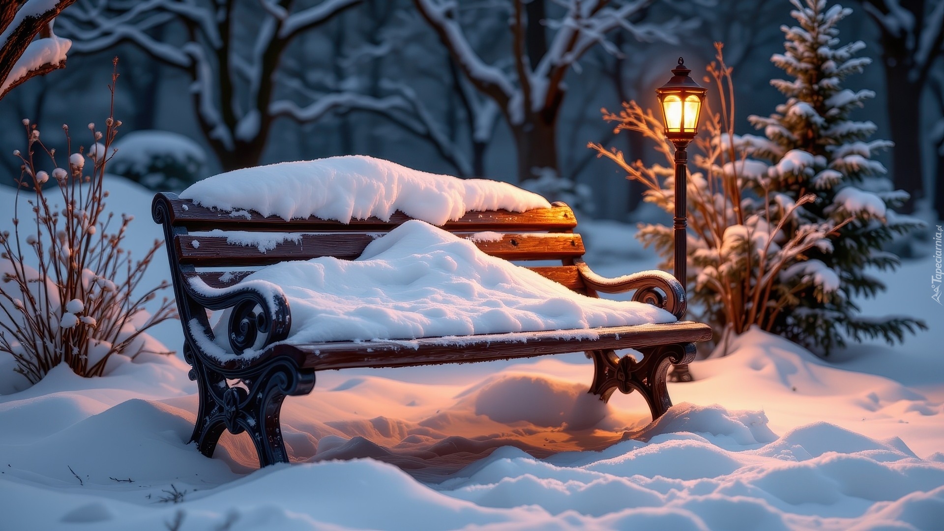 Edytor tapety: Zapalona latarnia obok ośnieżonej ławki i drzew