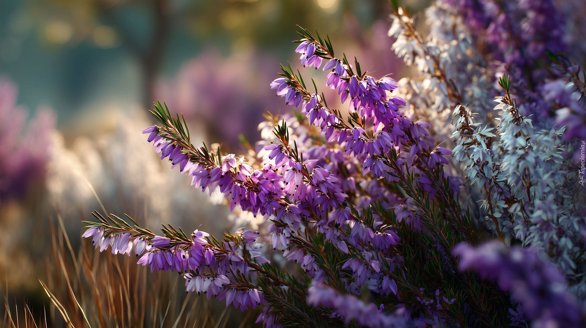 Edytor tapety: Fioletowe i białe wrzośce na rozmytym tle